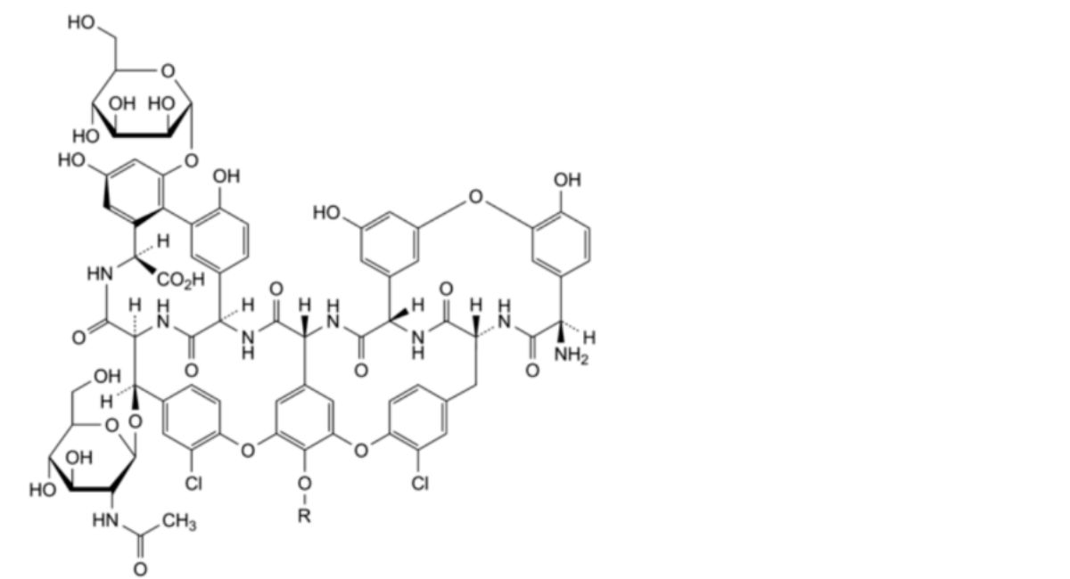 A teicoplanin-like related substance is defined as a substance that shares the same glycopeptide core structure of the parent molecule, composed of a linear heptapeptide aglycone, an α-D-mannose and an acetyl-β-D-glucosamine. The R′ side chains in the teicoplanin-like related substances RS A2-6a, RS A2-6b and RS A2-6c are unknown.