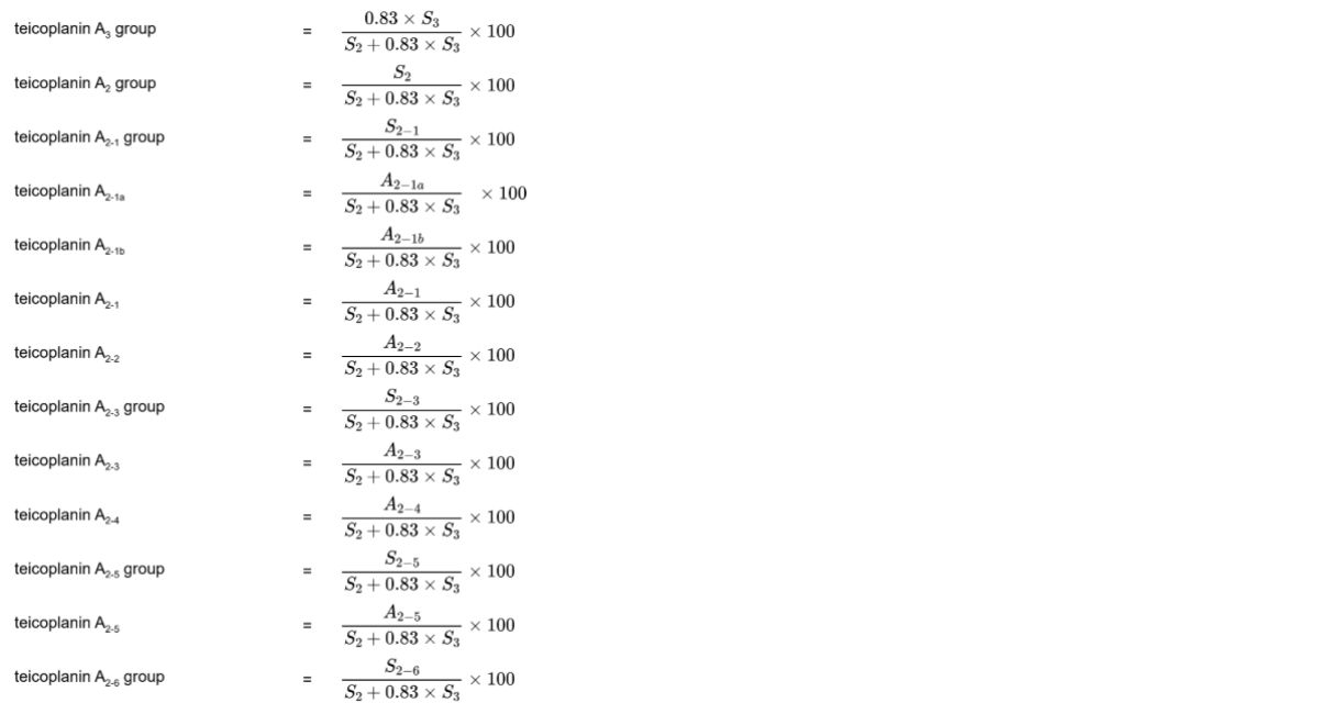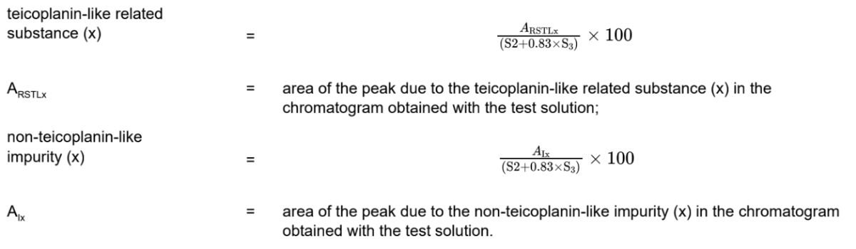 S2-3 = sum of the areas of the peaks due to teicoplanin A2-3 group in the chromatogram obtained with the test solution.