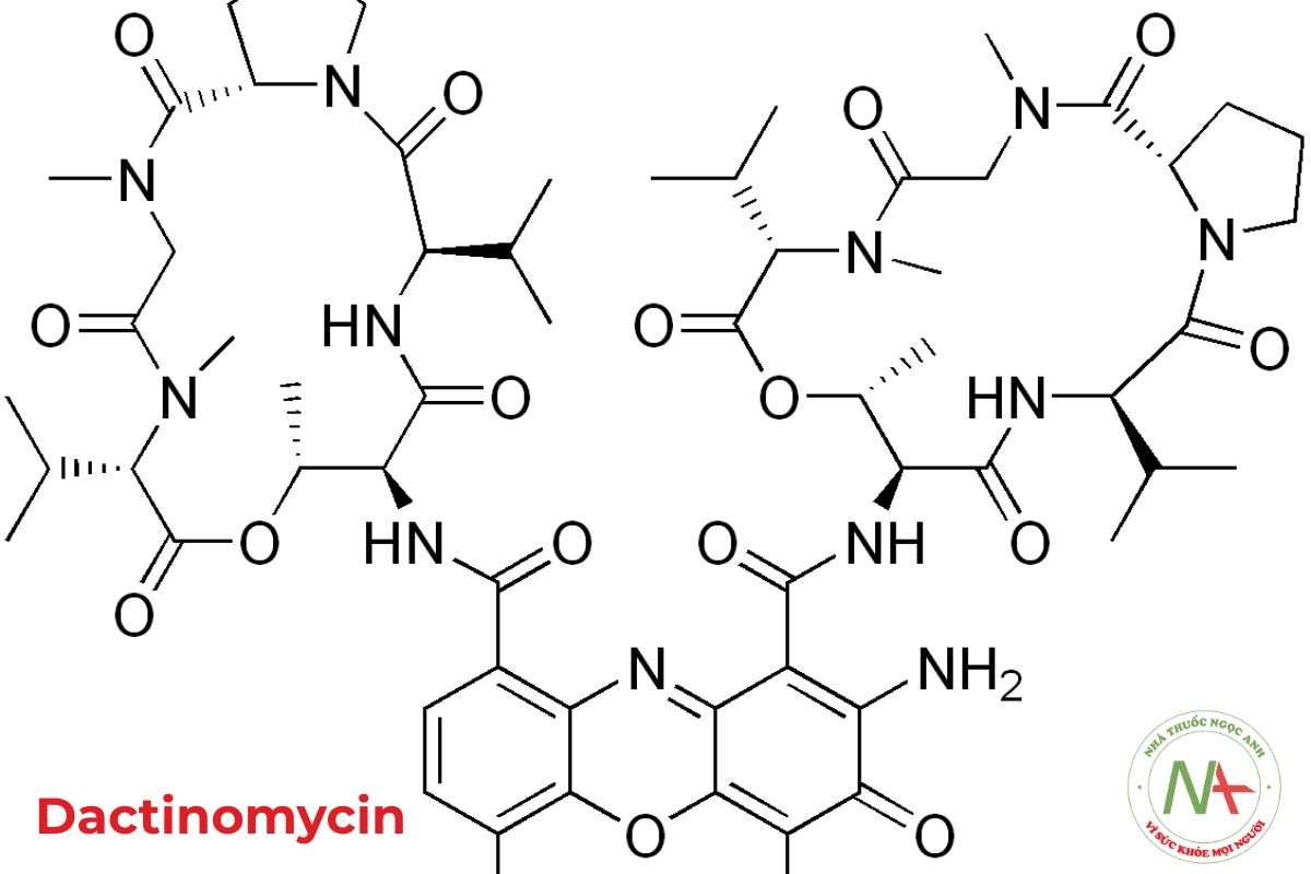 - Dactinomycin là một kháng sinh chống ung thư có nguồn gốc từ các chủng Streptomyces, đặc biệt là Streptomyces parvulus. Thuốc thể hiện tác dụng kìm khuẩn, chủ yếu trên vi khuẩn Gram dương, tuy nhiên không được sử dụng cho mục đích kháng khuẩn do độc tính tế bào đáng kể. Cơ chế tác dụng chống ung thư chính của dactinomycin là ức chế sự tăng sinh tế bào thông qua việc tạo phức bền vững với DNA, từ đó cản trở quá trình tổng hợp RNA phụ thuộc DNA. Quá trình tổng hợp protein và DNA cũng bị ức chế, nhưng đòi hỏi nồng độ dactinomycin cao hơn so với ức chế RNA. Dactinomycin có khả năng làm tăng cường tác dụng độc tế bào của xạ trị. Ngoài ra, thuốc còn có tác dụng ức chế miễn dịch và một phần hoạt tính hạ calci huyết tương tương tự như lincomycin.