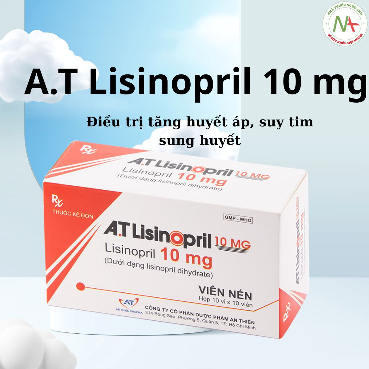 A.T Lisinopril 10 mg được chỉ định trong điều trị tăng huyết áp, suy tim sung huyết và điều trị nhồi máu cơ tim (gồm tăng huyết áp do mạch máu thận, tăng huyết áp vô căn)