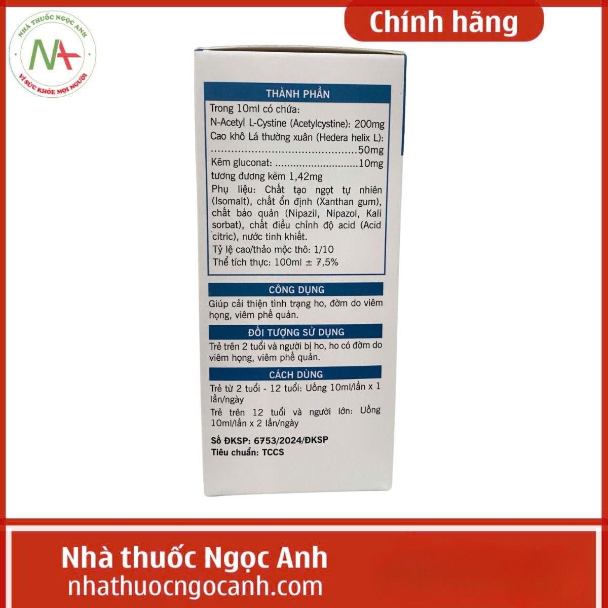 - Cao khô Lá thường xuân (Hedera helix L) có công dụng giãn phế quản, kích thích tiết dịch lỏng làm loãng đờm, dịu cơn ho nhờ chứa các hoạt chất nhóm saponin, từ đó hỗ trợ giảm ho, long đờm. Thành phần này cũng có tác dụng chống viêm, cải thiện các kích ứng đường hô hấp, có thể sử dụng để trị ho do viêm phế quản ở cả người lớn và trẻ nhỏ từ 2 tuổi trở lên.