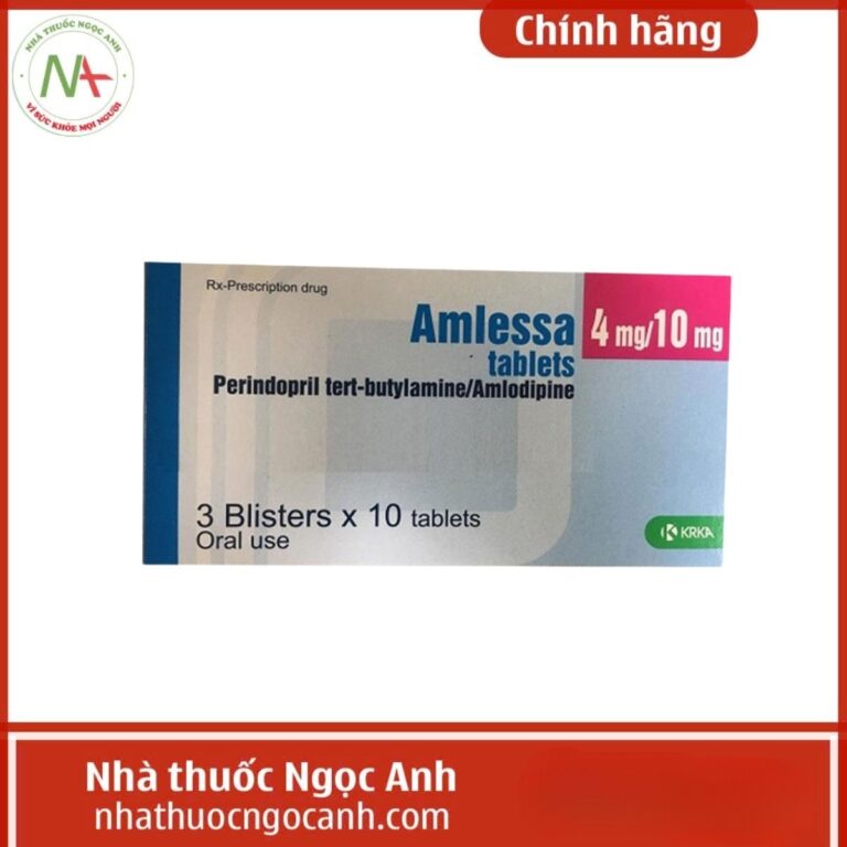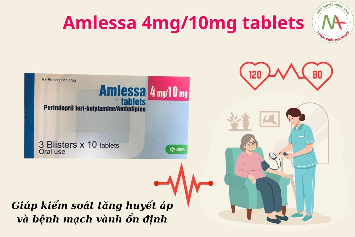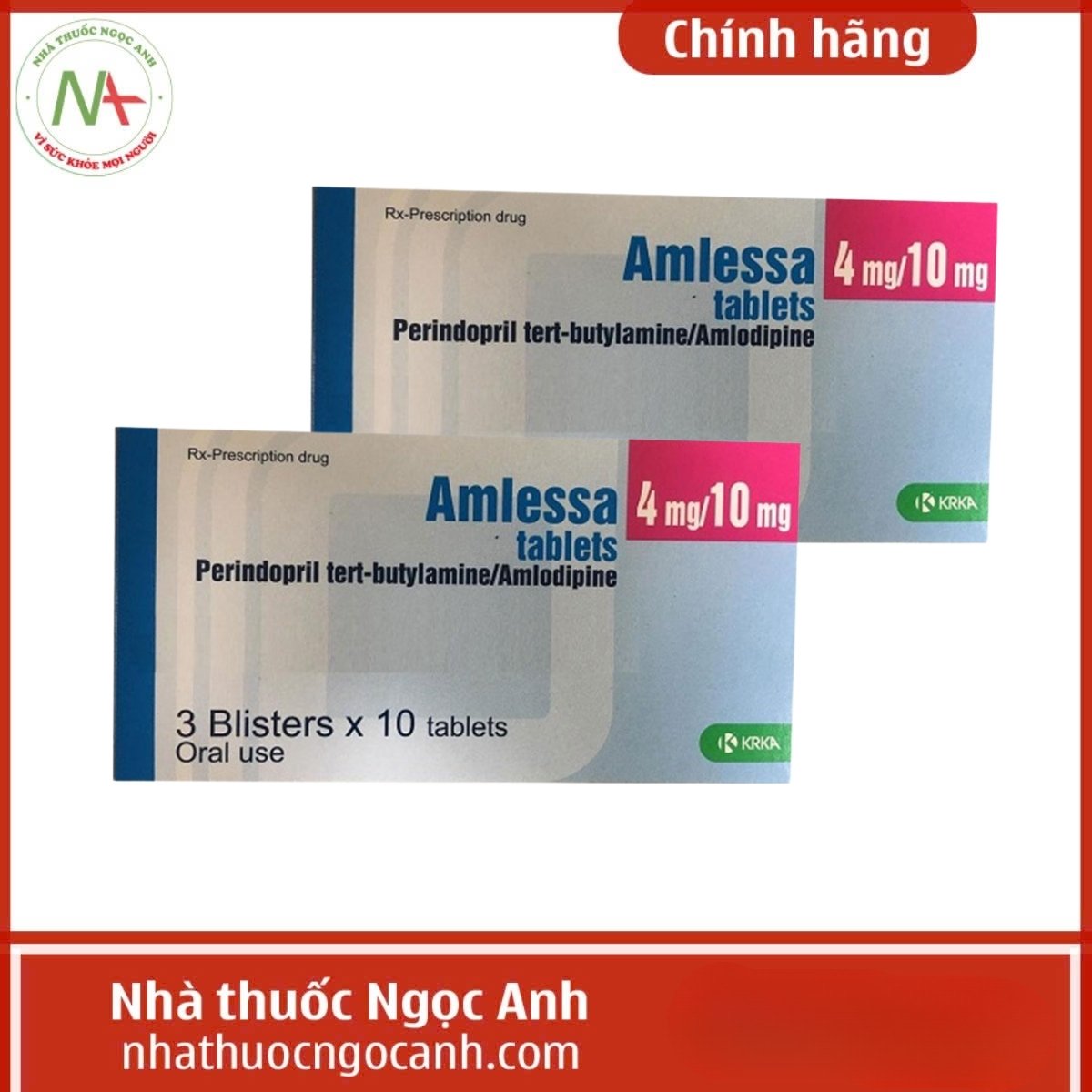 Thuốc Amlessa 4mg/5mg hỗ trợ điều trị thay thế cho các trường hợp đã sử dụng perindopril và amlodipin để điều trị huyết áp tăng vô căn và bệnh dạng mạch vành ổn định. Sản xuất tại KRKA; D.D.; Novo Mesto. Xuất xứ Slovenia.