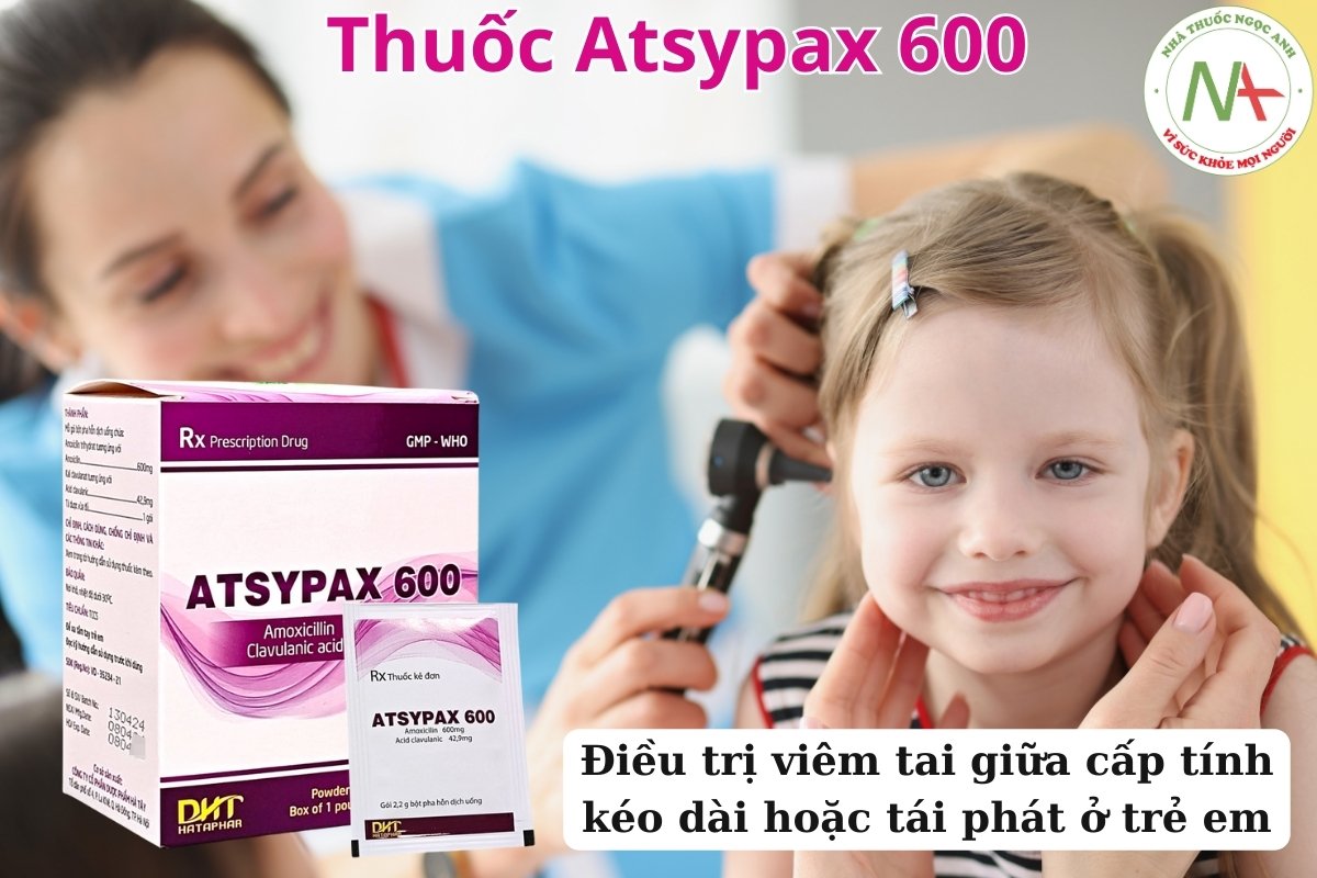 Thuốc Atsypax 600 được sử dụng để điều trị viêm tai giữa cấp tính kéo dài hoặc tái phát ở trẻ em. Thuốc đặc biệt hiệu quả trong điều trị các trường hợp viêm tai giữa do vi khuẩn Streptococcus pneumoniae, đặc biệt là với chỉ số MIC penicilin ≤ 2mcg/ml.