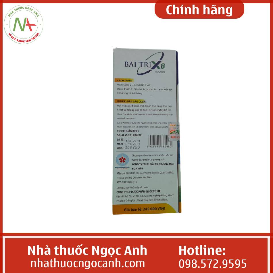Bai tri X8 Hoa Vien hiện đang được bán tại nhà thuốc Ngọc Anh với giá niêm yết là 250.000 đồng / hộp. Giá đã bao gồm thuế theo luật hiện hành.