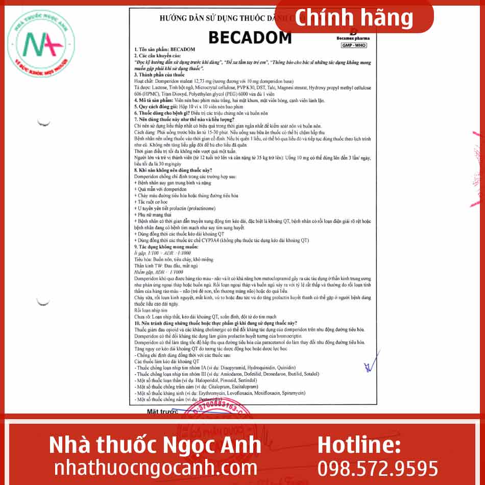 - Hoạt chất chính mang tác dụng dược lý của Becadom là Domperidon Maleat 10mg.
