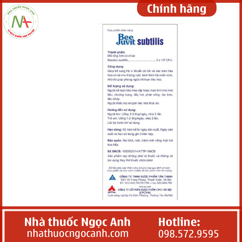 Beejuvit Subtilis là thực phẩm chức năng. Sản phẩm được sản xuất tại Công ty Cổ phần Dược phẩm CPC1 Hà Nội (CPC1HN). Công ty nằm tại vị trí Cụm công nghiệp Hà Bình Phương, Thường Tín, Hà Nội.