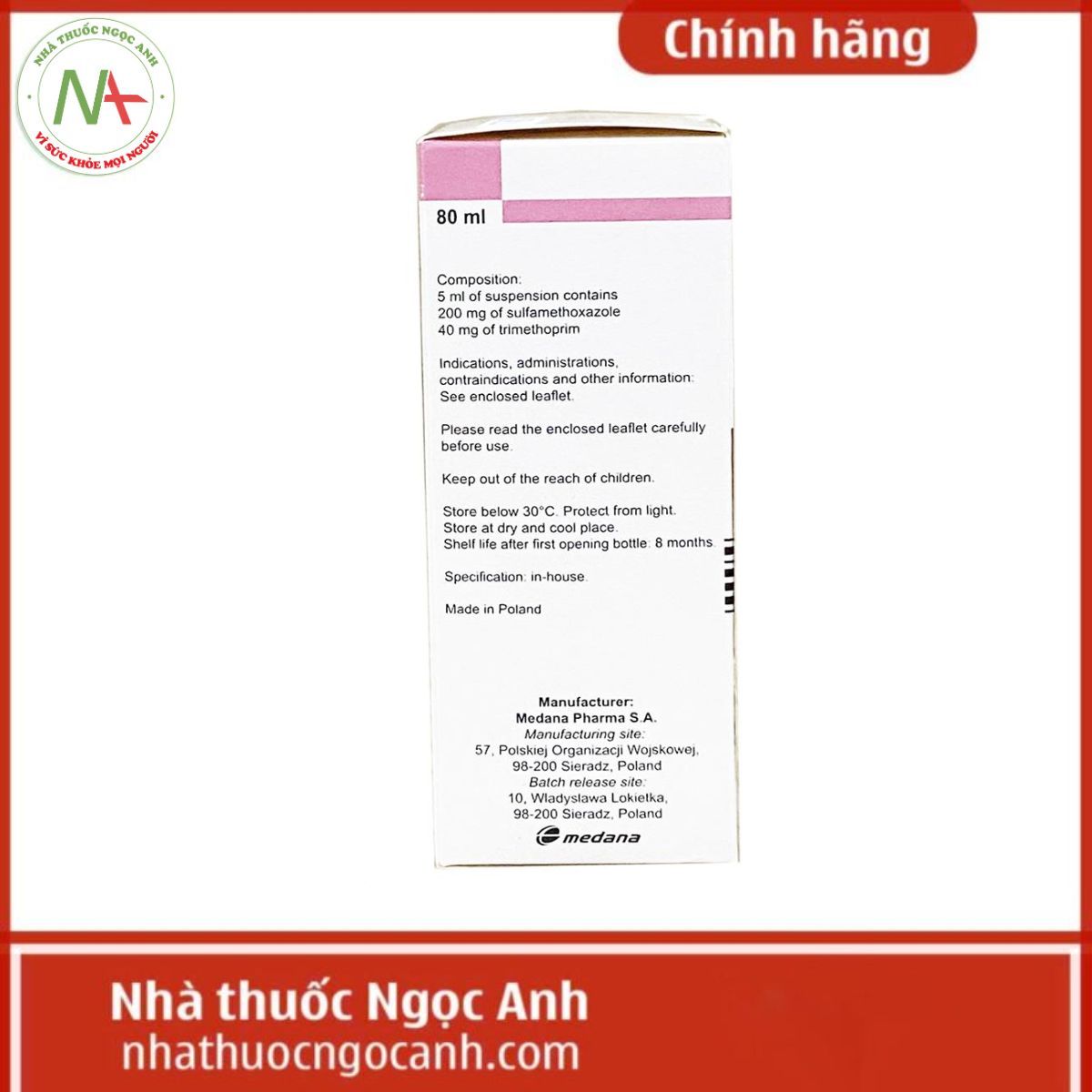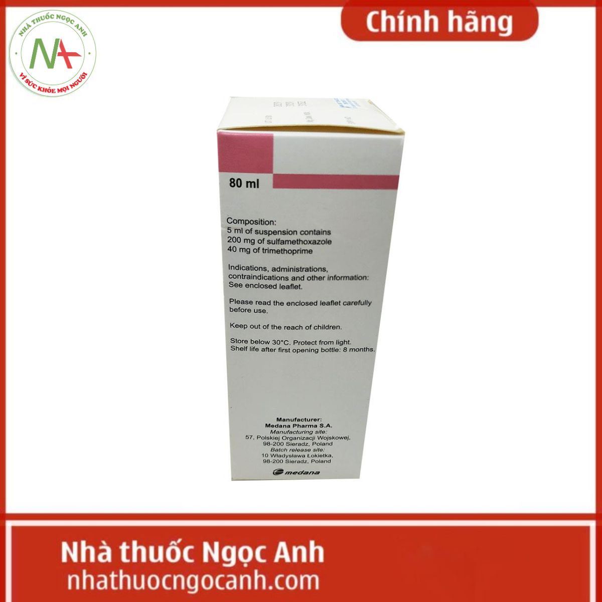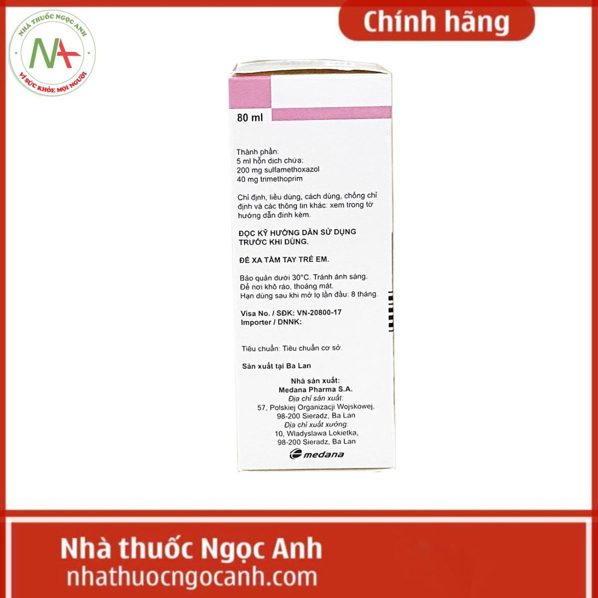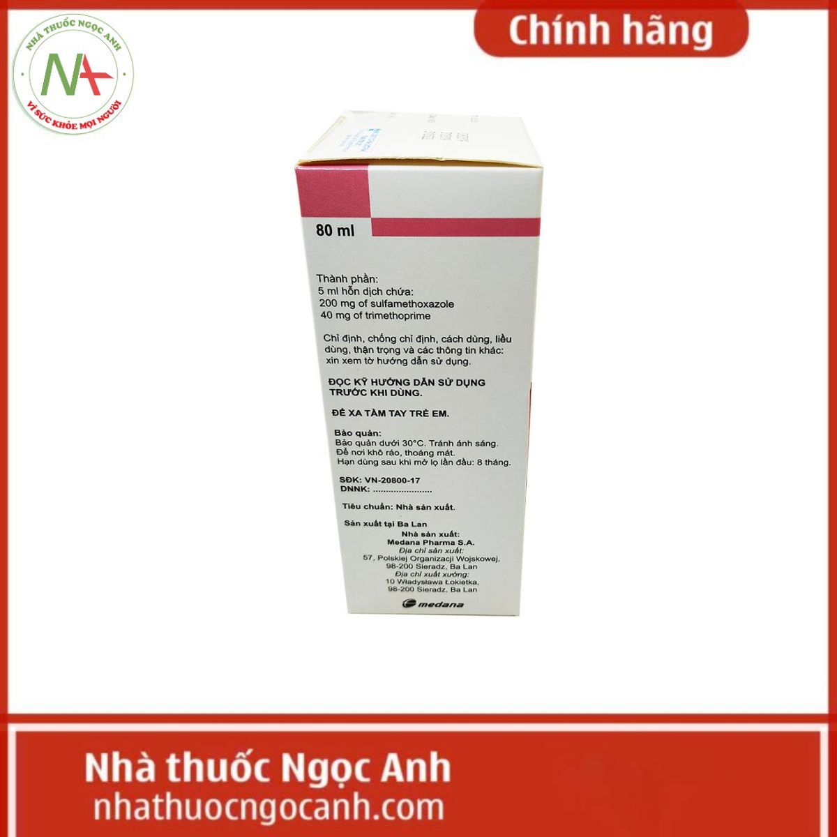 - Mỗi 5ml chứa: Sulfamethoxazol 200mg; Trimethoprim 40mg