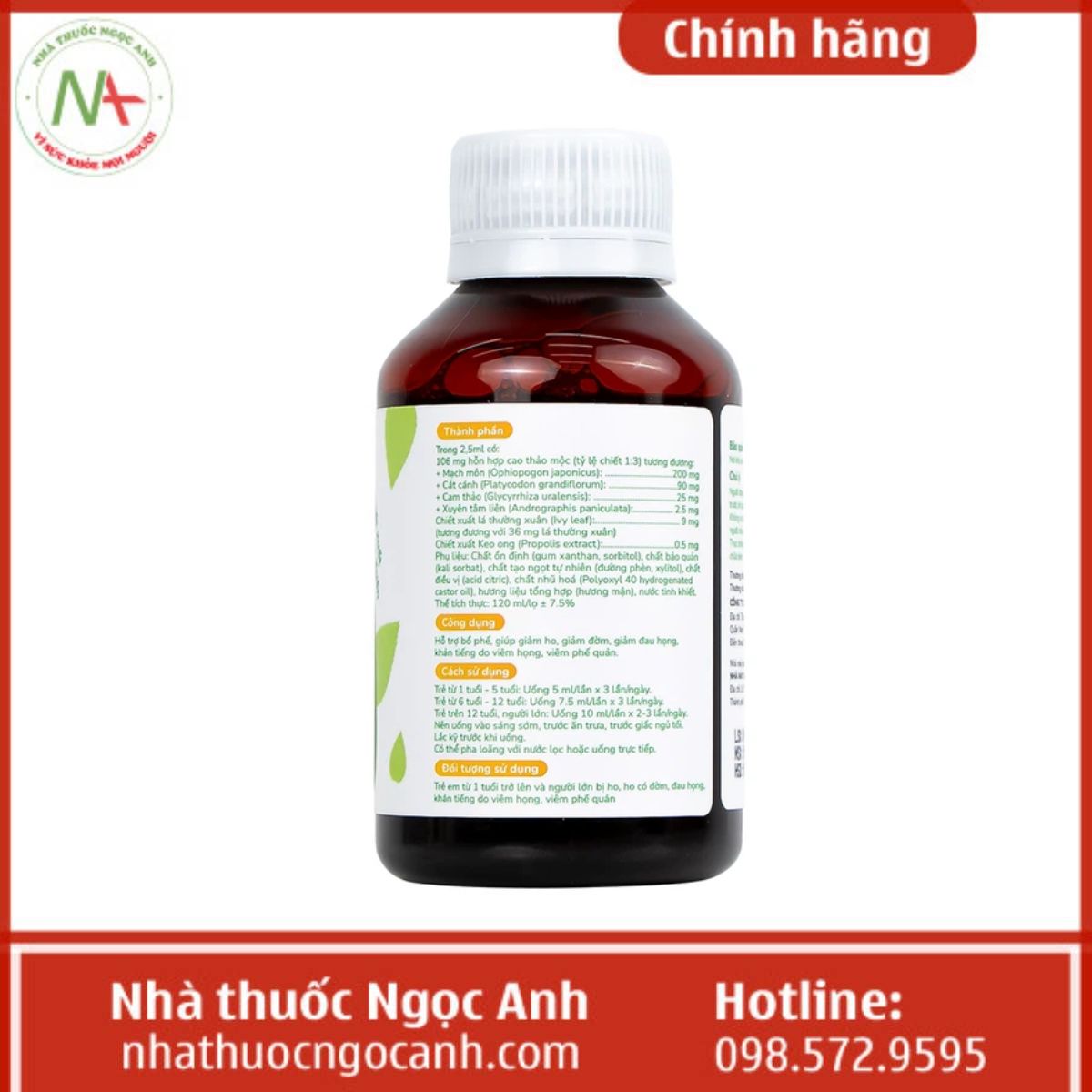 - Chiết xuất lá thường xuân, Xuyên tâm liên , giúp ngăn chặn sự phát triển của vi khuẩn gây bệnh viêm nhiễm đường hô hấp, giúp làm dịu cơn ho, hỗ trợ điều trị viêm họng, sưng họng, viêm phế quản, và viêm amidan,tăng cường khả năng miễn dịch, làm sạch đường hô hấp, giúp long đờm.