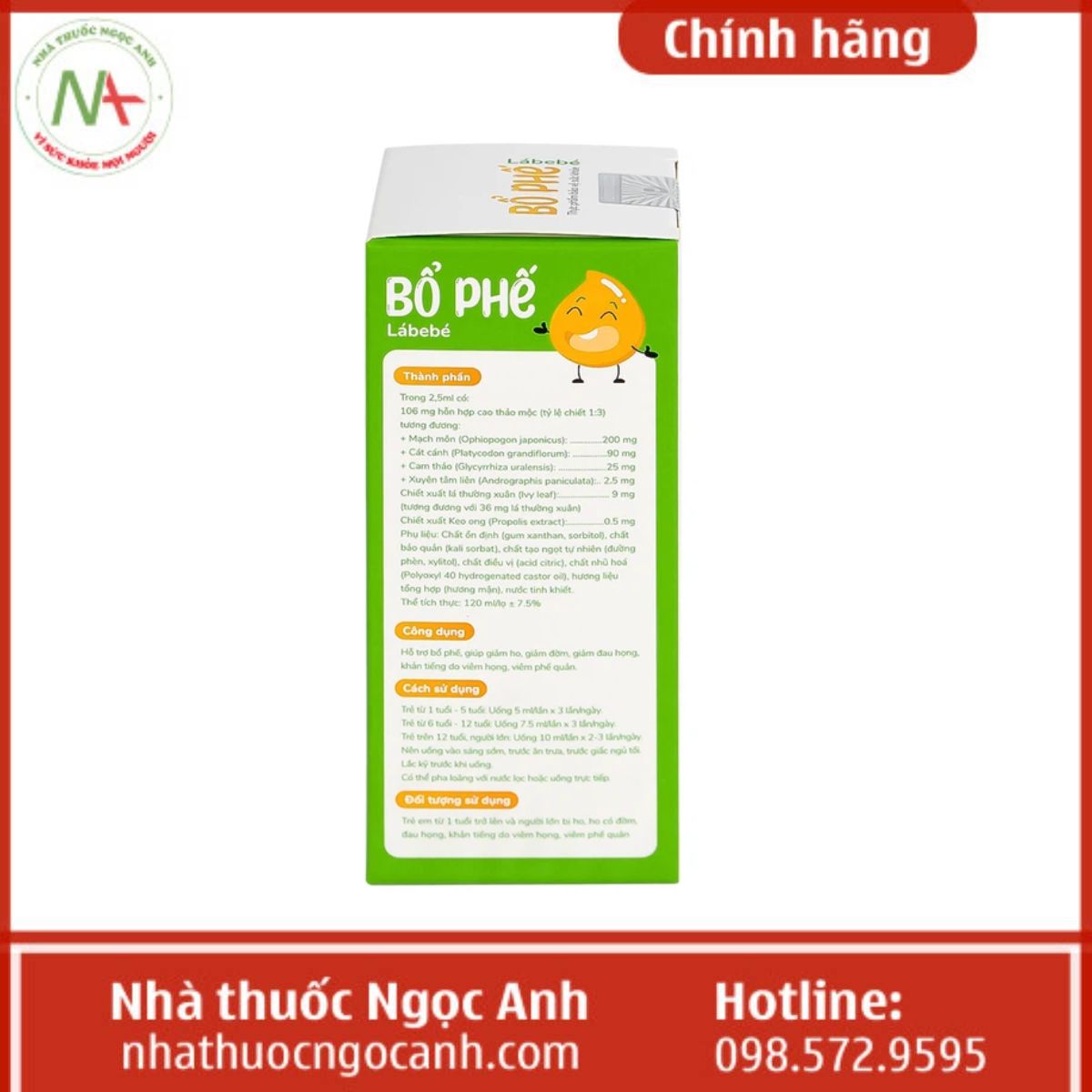 Bổ Phế Lábebé 120ml có tác dụng giúp giảm ho, bổ phế, giảm đau họng, giảm đờm và giảm khản tiếng do viêm phế quản, viêm họng