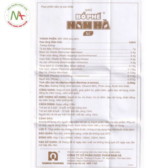 - Bổ Phế Nam Hà XC được sản xuất bởi Công Ty Cổ Phần Dược Phẩm Nam Hà, một trong những công ty đi đầu trong việc sản xuất các sản phẩm, thuốc có nguồn gốc thảo dược.