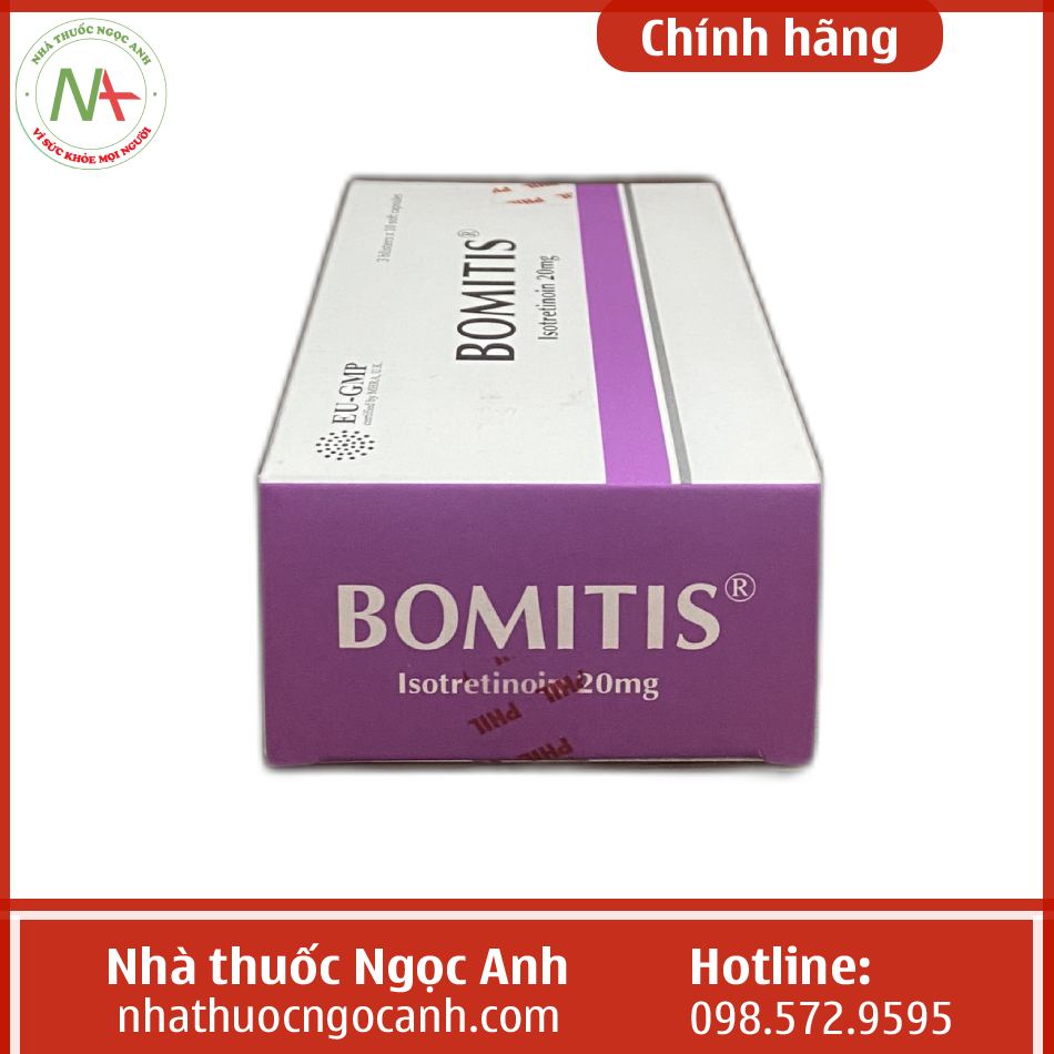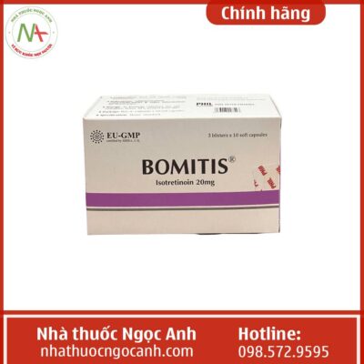 Bomitis thuộc nhóm thuốc kháng viêm có thành phần hoạt chất chính là Isotretinoin, thuốc được chỉ định điều trị mụn trứng cá nặng (mụn bọc, mụn trứng cá to có nguy cơ để sẹo tại chỗ, mụn nang) không đáp ứng với điều trị thông thường bằng thuốc kháng sinh kết hợp thuốc bôi tại chỗ.