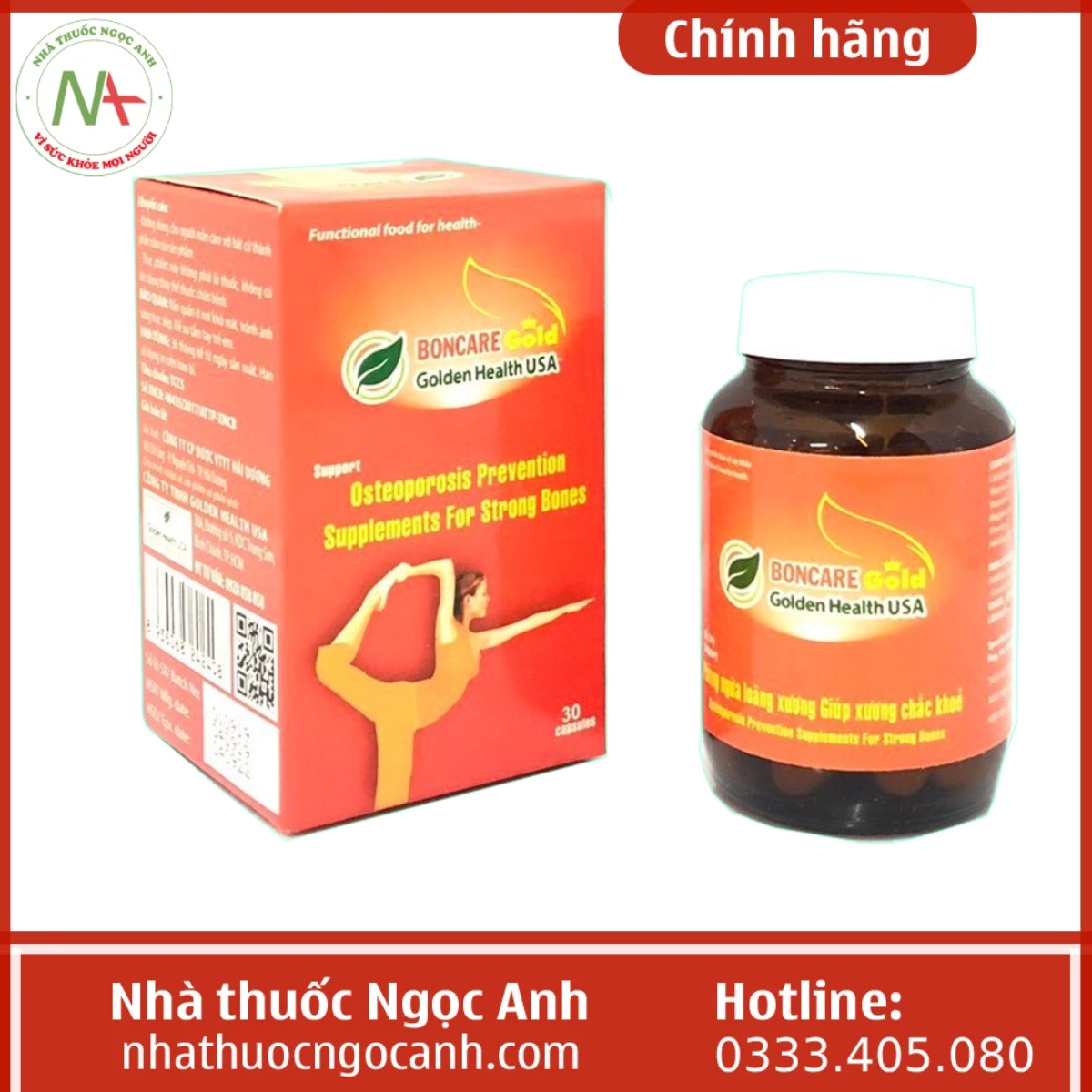 Boncare Gold là sản phẩm bổ sung có chứa các thành phần vitamin và khoáng chất. Sản phẩm giúp bảo vệ, củng cố sức khỏe cho xương khớp, giảm nguy cơ mắc bệnh về xương. Đây là một sản phẩm do Công ty cổ phần dược vật tư y tế Hải Dương sản xuất và có số lưu hành là 3354/2021/ĐKSP.