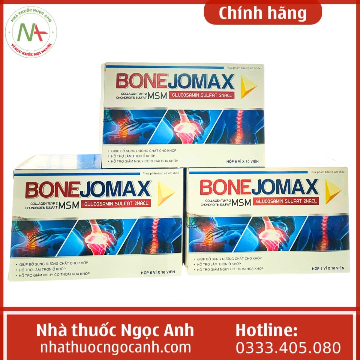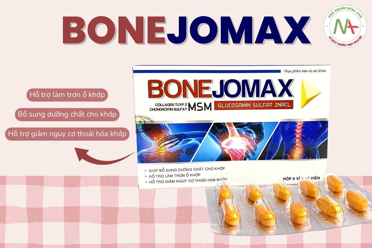 => Bonejomax hỗ trợ cung cấp dinh dưỡng cho khớp xương, giúp tăng cường làm trơn các khớp, cải thiện độ linh hoạt khi vận động. Đồng thời còn giảm mỏi, nhức và thoái hóa khớp xương.
