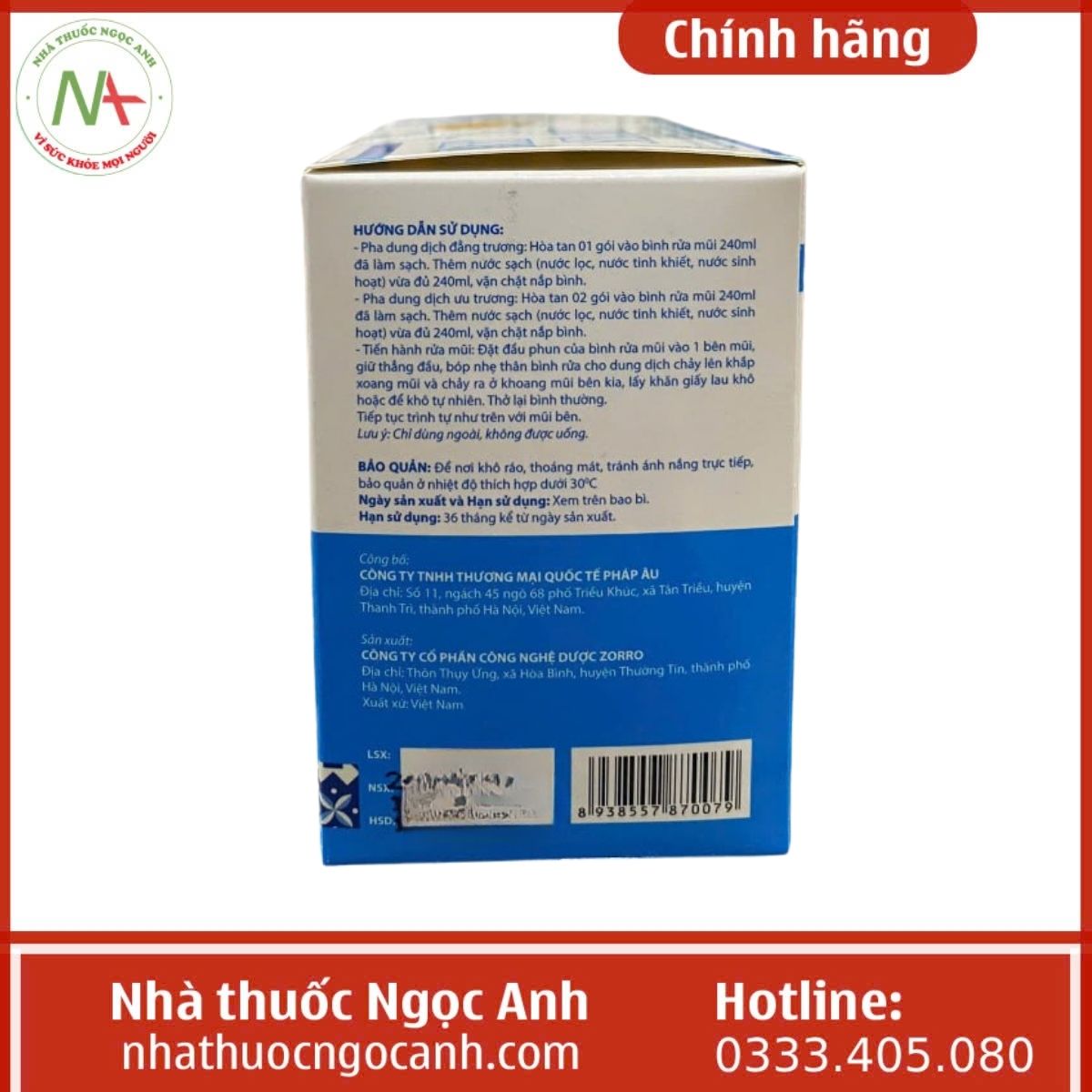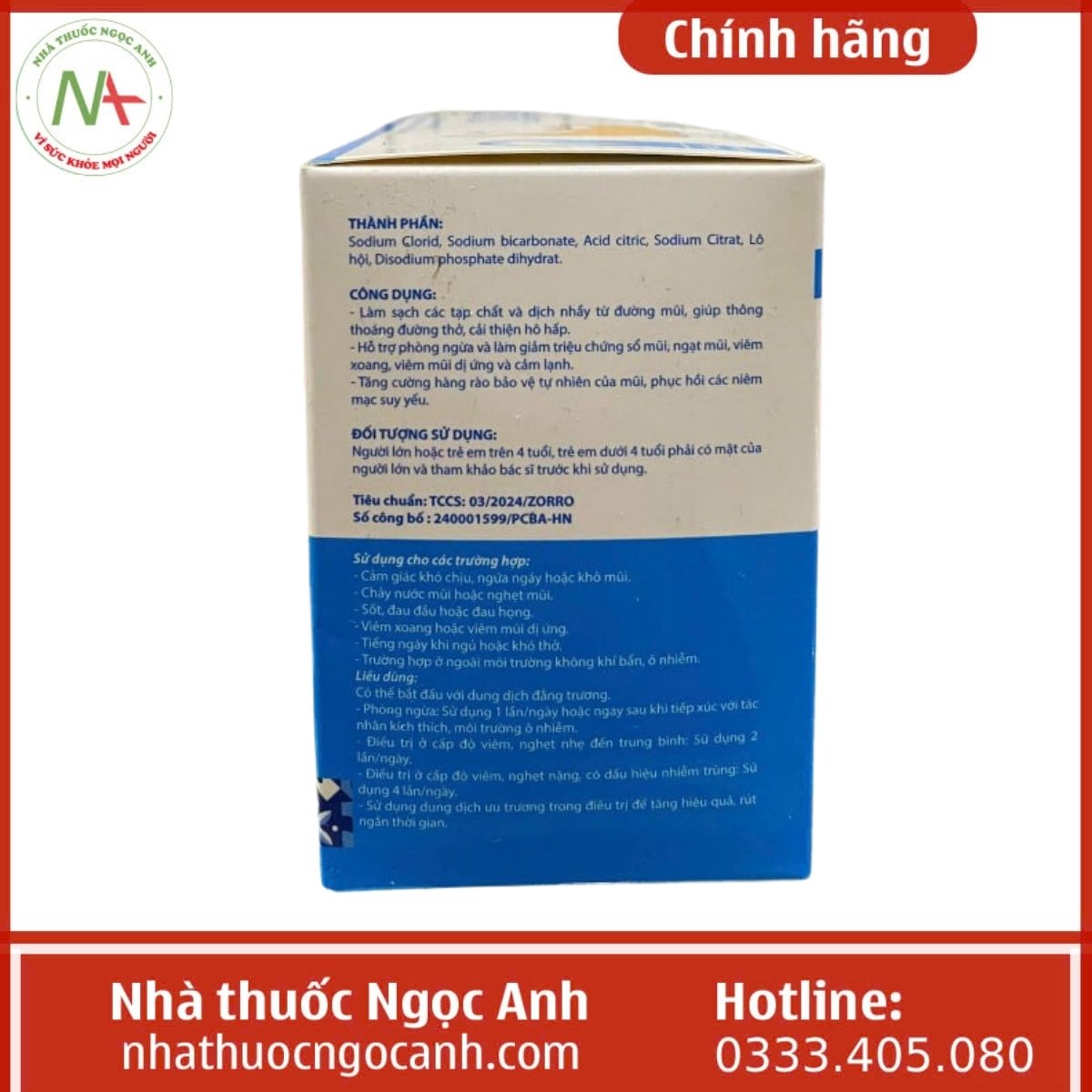 Sodium Bicarbonate (Natri bicarbonat): Làm dịu niêm mạc mũi, giảm kích ứng và viêm. Nó giúp duy trì độ pH cân bằng trong dung dịch rửa mũi và có tác dụng làm mềm dịch nhầy, giúp làm sạch dễ dàng hơn.
