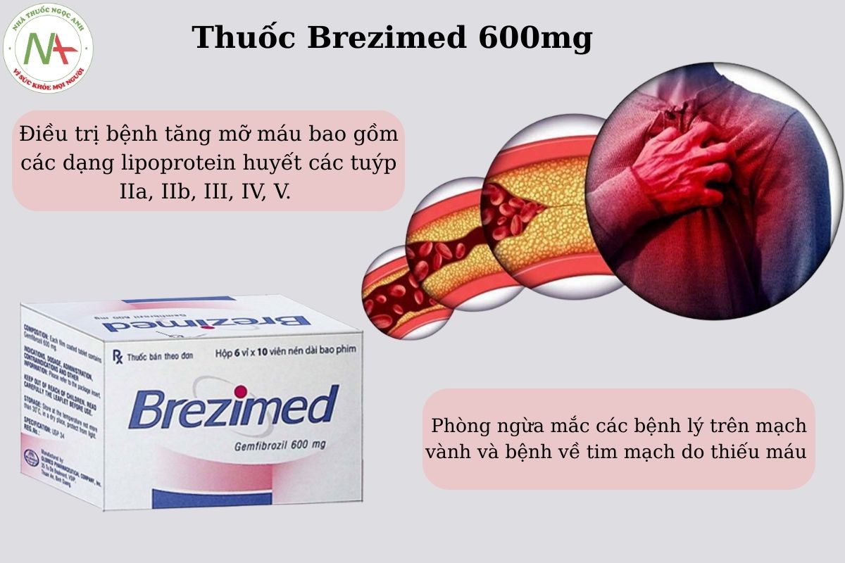 Nhờ thành phần hoạt chất Gemfibrozil, thuốc Brezimed 600mg cho tác dụng trong việc làm giảm nhanh nồng độ cholesterol toàn phần và lượng triglycerid máu. Thuốc Brezimed 600mg được dùng trong việc điều trị vệnh về tăng mỡ máu bao gồm các dạng lipoprotein huyết các tuýp IIa, IIb, III, IV, V.