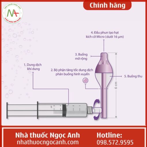 - Thiết kế vòi phun tiên tiến, được cấp bằng sáng chế tại Châu u, nhẹ nhàng lấy đi bụi bẩn, dịch nhầy hô hấp chỉ trong khoảng 4 giây cho 5ml dung dịch.