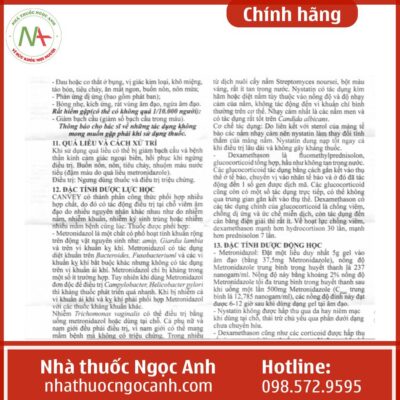 Thuốc Canvey là sự phối hợp của nhiều hoạt chất: Metronidazole + Chloramphenicol + Nystatin + Dexamethasone acetate, mang lại các tác dụng sau đây: