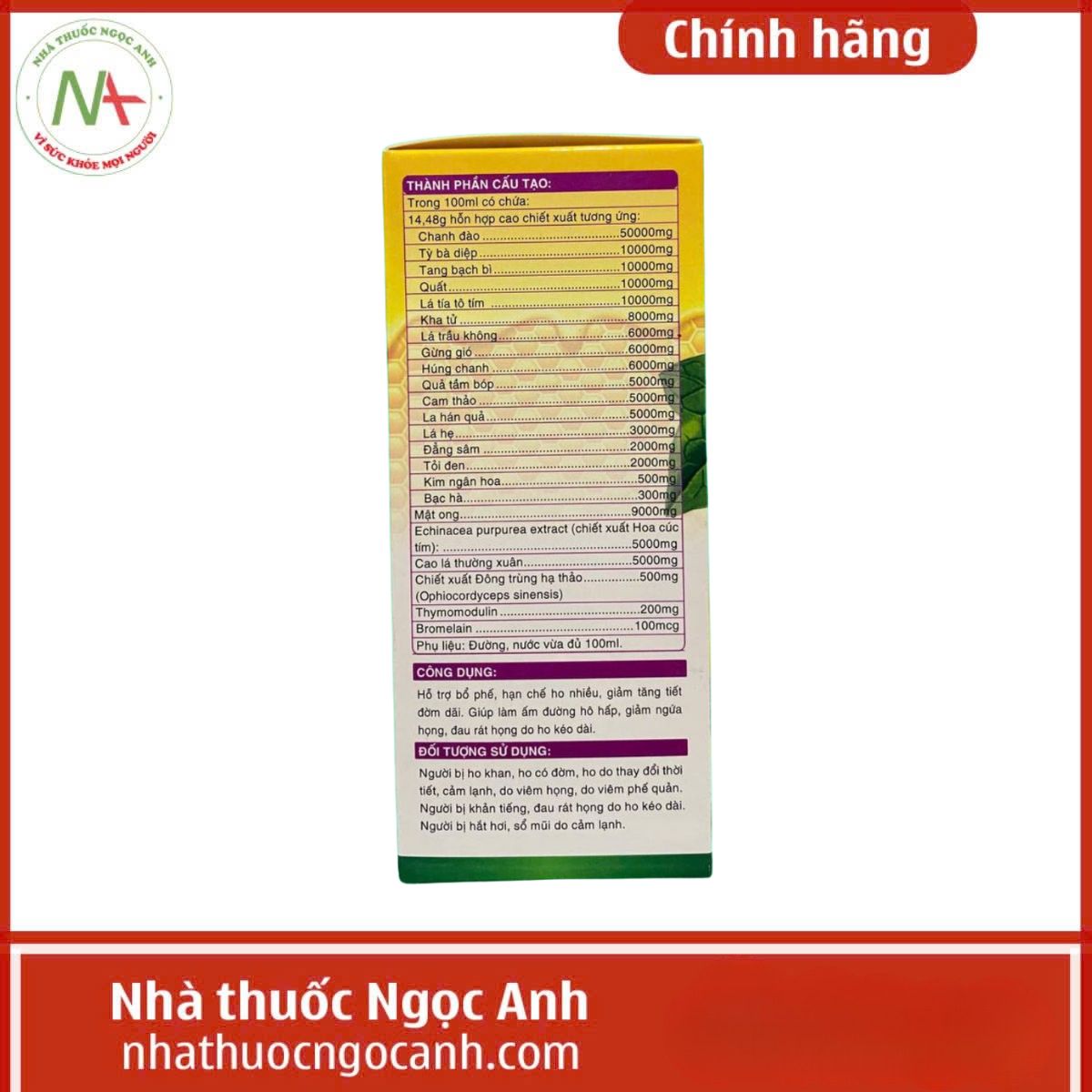 - Các dược liệu giúp cải thiện sức khỏe hệ hô hấp, giảm triệu ho, ho có đờm bao gồm Tỳ bà diệp, chanh đào, tang bạch bì, quất, lá tía tô tím, kha tử, lá hẹ, gừng, húng chanh, quả tầm bóp, la hán quả, bạc hà và cao lá thường xuân. Ngoài công dụng chính giảm ho có đờm, các dược liệu còn đóng vai trò riêng, bao gồm: Tang bạch bì hỗ trợ cải thiện tình trạng hen suyễn; quất và chanh đào cung cấp hàm lượng lớn vitamin C giúp tăng cường sức đề kháng; lá tía tô giúp trị triệu chứng cảm lạnh, cảm cúm; kha từ giảm tình trạng khàn tiếng do ho kéo dài nhiều ngày; húng chanh giúp làm dịu cổ họng, kháng khuẩn; quả tầm bóp hỗ trợ thanh nhiệt, giải độc, hạn chế tình trạng viêm đường hô hấp; bạc hà tạo cảm giác the mát, dễ chịu.