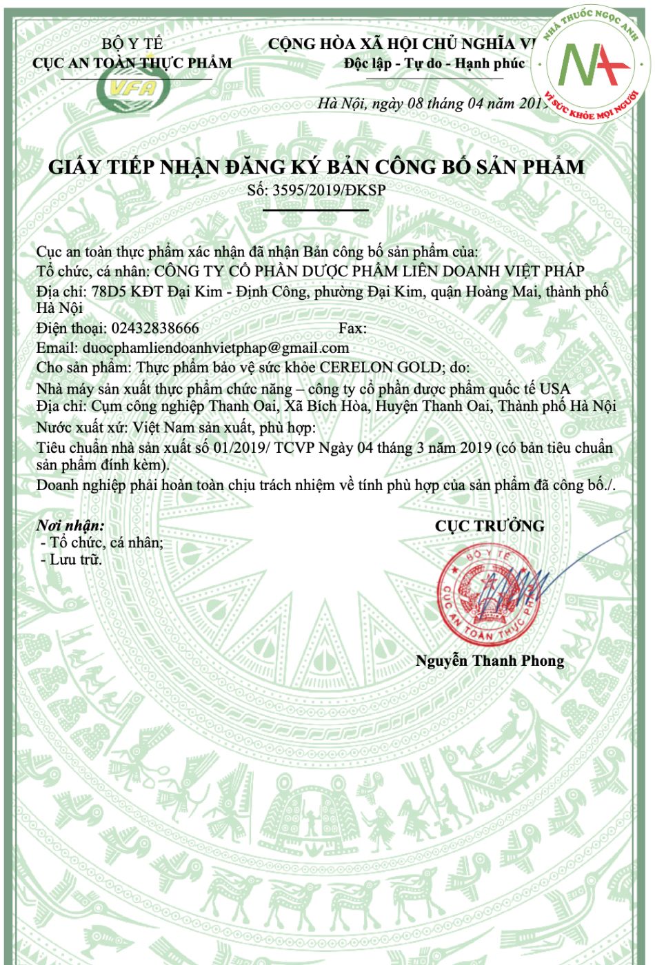 - Số đăng ký: 3595/2019/ĐKSP.