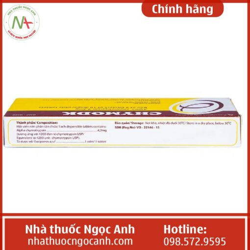 - Hoạt chất chính là Alphachymotrypsin (tương ứng 4200IU chymotrypsin USP) 4,2 mg