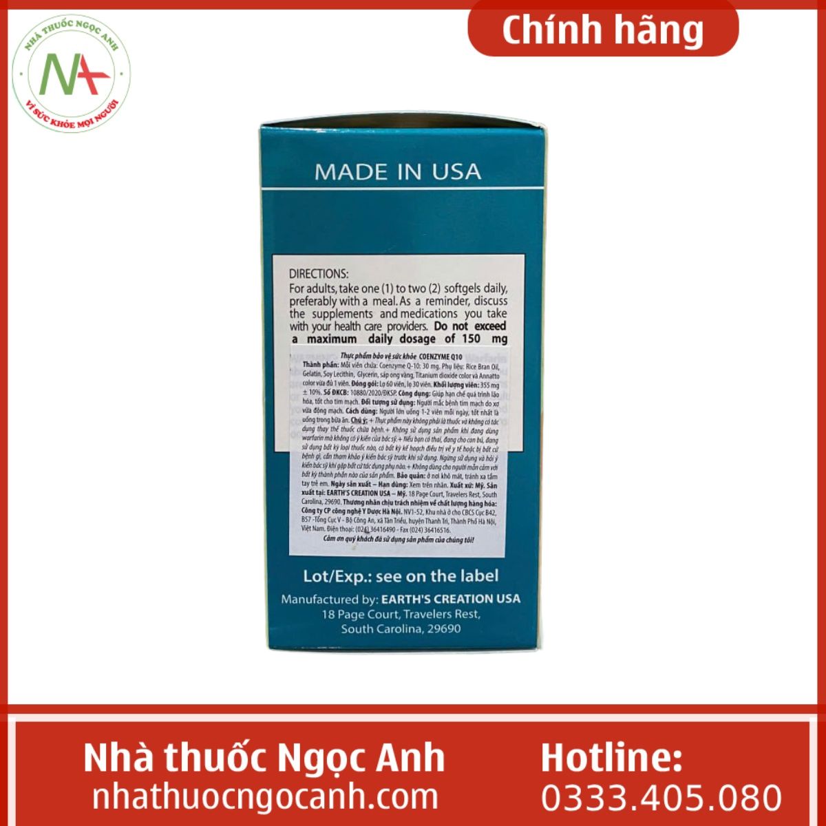 - Co-Enzyme Q-10 30mg Earth’s Creation không phải là thuốc, không có tác dụng thay thế thuốc chữa bệnh.