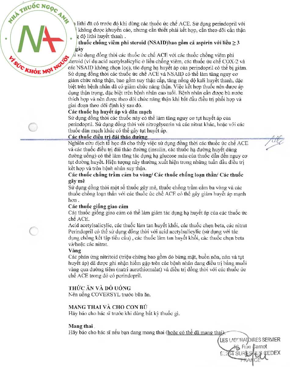 | Thuốc tăng kali máu như: Thuốc lợi tiểu giữ kali, heparin, giảm đau kháng viêm phi steroid | Không nên phối hợp với COVERSYL vì làm tăng kali huyết mạnh (có thể gây tử vong). |