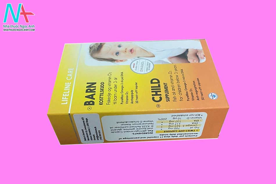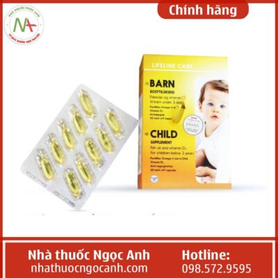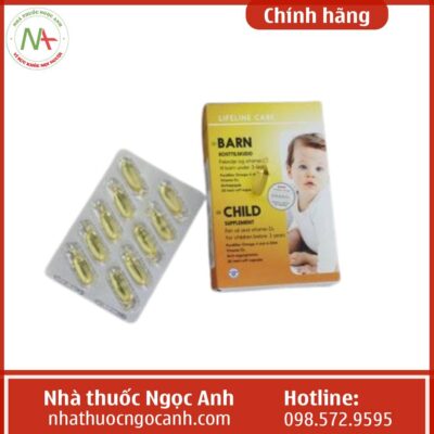 Dầu cá Kim Cương Na Uy Lifeline Care Child được đóng gói trong bao bì màu vàng, trên vỏ hộp có in hình một bé trai. Trên vỏ họp có in tên sản phẩm và thương hiệu: “Lifeline Care”, “BARN”, “CHILD”. Mặt sau hộp có đầy đủ thông tin về công dụng, thành phần, cách dùng, nhà sản xuất bằng tiếng Anh. Ngoài ra, một số sản phẩm có dán thêm nhãn phụ bằng tiếng Việt.