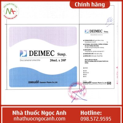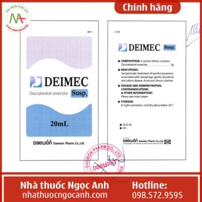 Thuốc Deimec Susp. chứa hoạt chất chính là Dioctahedral, thuốc được sản xuất bởi công ty Daewon Pharm. Co., Ltd và thường được chỉ định trong điều trị những bệnh lý liên quan đến đường tiêu hóa.
