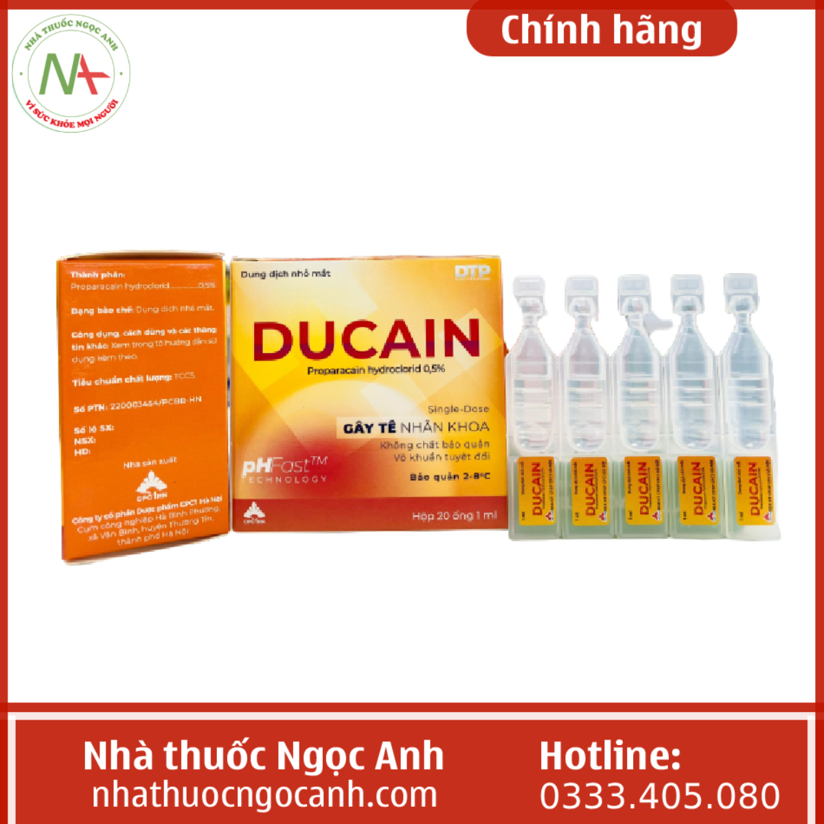 Sản phẩm Ducain có thành phần chính là Proparacain, có công dụng gây tê cục bộ nhanh trong thời gian ngắn, thường được sử dụng để gây tê trong đo nhãn áp, lấy dị vật hay khâu giác mạc.