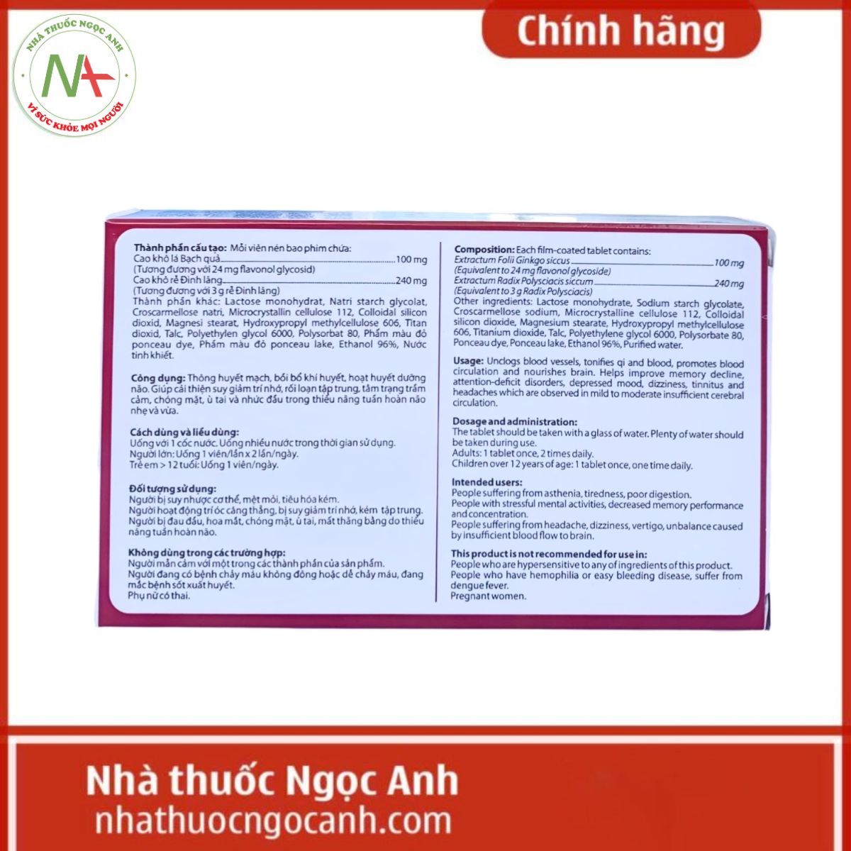 - Cao khô lá bạch quả có chứa thành phần Terpenoid, Flavonoid glycosides, Ginkgolide A, B, C và Bilobalide có tác dụng chống oxy hóa mạnh, làm giãn mạch máu giúp tăng tuần hoàn não, tăng lưu lượng máu lên não, bảo vệ tế bào thần kinh khỏi tổn thương do stress oxy hóa, cải thiện trí nhớ, bảo vệ nơron thần kinh, bảo vệ hàng rào máu não.