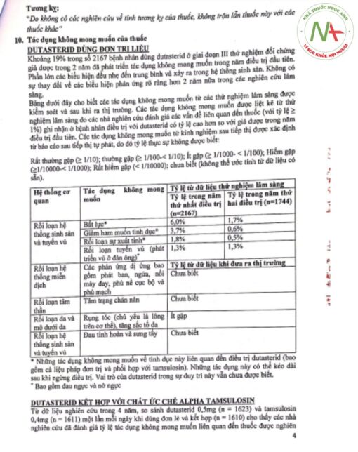 | Tương kỵ | Hiện chưa có nghiên cứu về sự tương kỵ giữa Dutasterid và các thuốc khác.