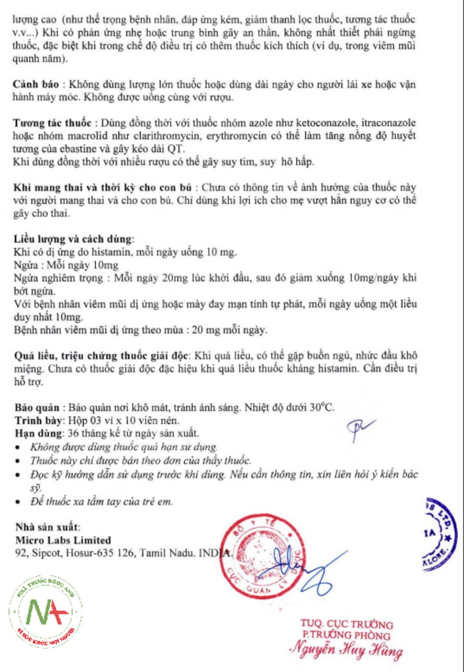 - Liều dùng điều trị tình trạng viêm mũi dị ứng và nổi mề đay tự phát mạn tính: 1 viên/ngày.