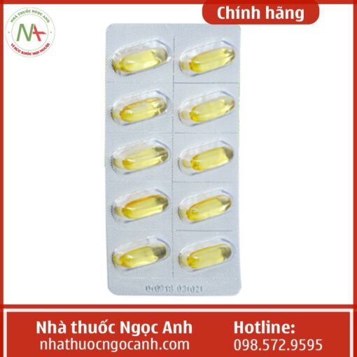 Quy cách đóng gói: Hộp 3 vỉ x 10 viên nang mềm.