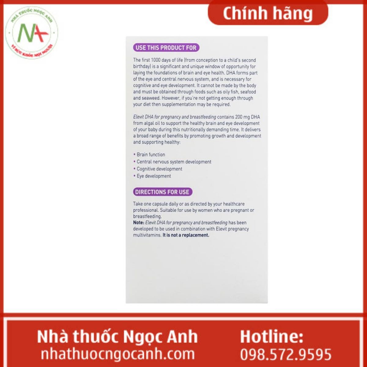 - Elevit DHA For pregnancy and breastfeeding không phải là thuốc, không có tác dụng thay thế thuốc chữa bệnh.