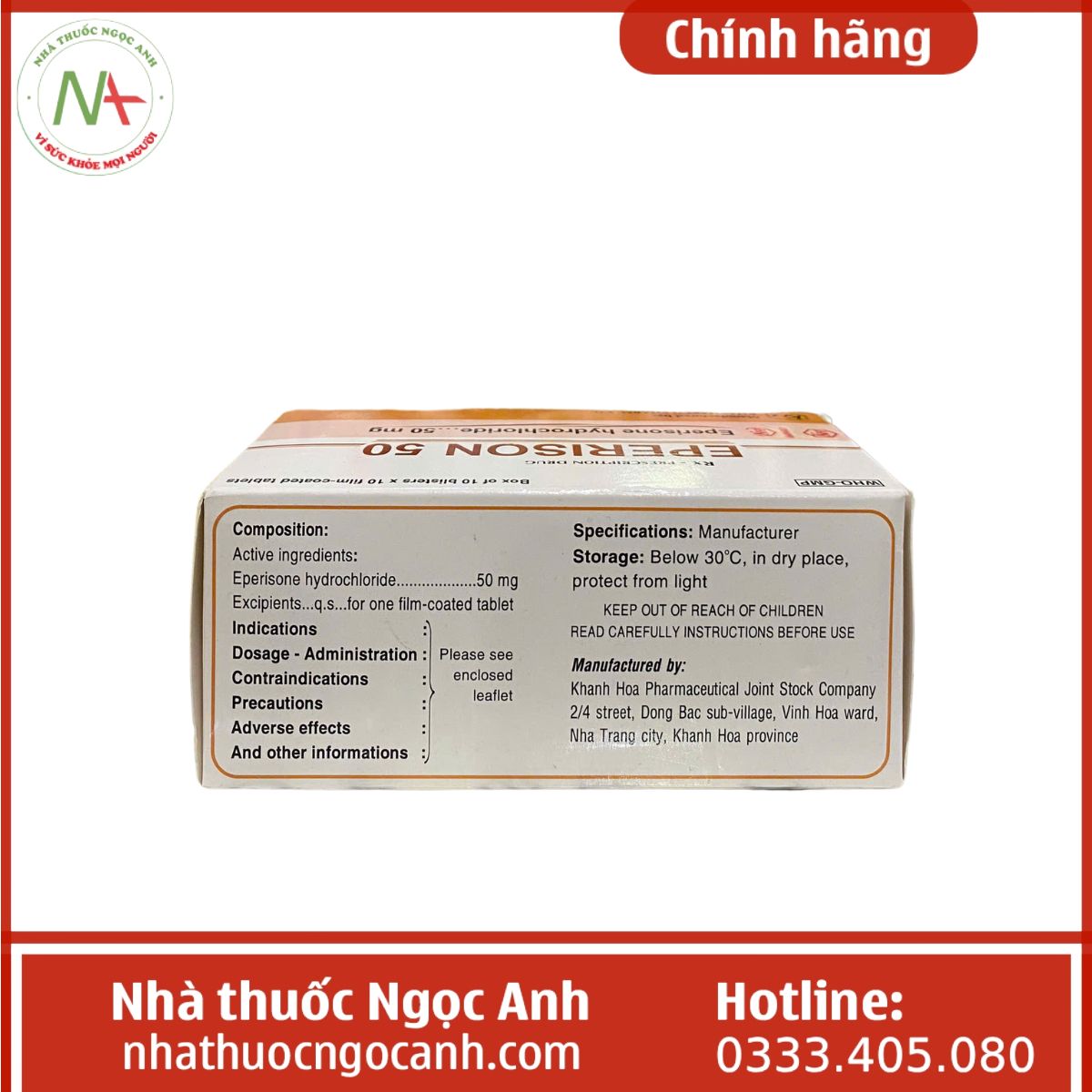 Hiện nay, giá bán của Eperison 50 đang được cập nhật tại nhà thuốc Ngọc Anh. Sự chênh lệch giá là không đáng kể. Bạn có thể tìm giá bán ở đầu trang. Hoặc để biết chi tiết về thông tin giá và sản phẩm, vui lòng liên hệ ngay với chúng tôi qua zalo, facebook, hotline 098 572 9595 hoặc nhắn tin trực tiếp tại website để được dược sĩ đại học tư vấn nhanh nhất.