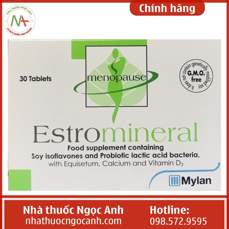- Estromineral là sản phẩm chứa các khoáng chất tự nhiên và hormon giúp bổ sung estrogen tự nhiên, canxi và những hoạt chất chống oxy hóa giúp điều hòa được nội tiết tố cho những phụ nữ ở giai đoạn tiền mãn kinh,mãn kinh tiến triển, mãn kinh sớm. Giúp ngăn ngừa và cải thiện hiệu quả các triệu chứng khi mãn kinh như bốc hỏa, hồi hộp, lão hóa da, đổ mồ hôi. Giúp ngăn ngừa và làm giảm các nguy cơ mắc bệnh tim mạch, thoái hóa xương, loãng xương, co rút cơ bắp và chống lão hóa.