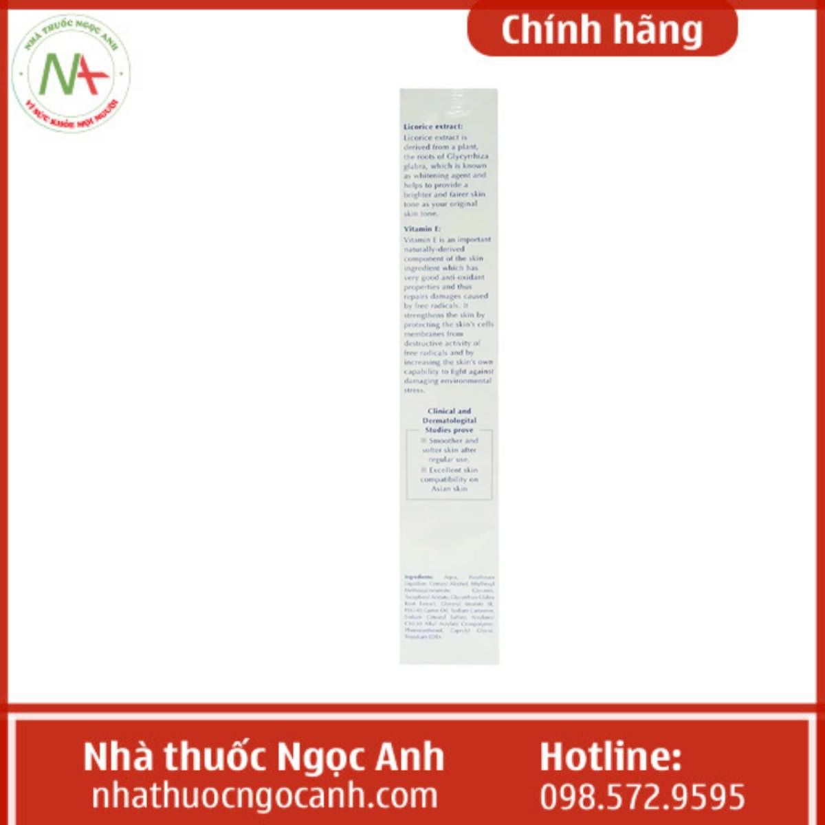 - Licorice Chiết xuất rễ cây cam thảo có nhiều tác dụng tốt đối với da, có đặc tính chống viêm, thành phần glabridin giúp làm sáng da, duy trì độ ẩm cho da, giúp làm mờ vết thâm, nám và tàn nhang, giảm sắc tố melanin, giúp làm dịu các vết kích ứng, đỏ hoặc viêm da. Chiết xuất rễ cây cam thảo cũng chứa các hợp chất chống oxy hóa giúp ngăn ngừa lão hóa da , bảo vệ da làm lành nhanh chóng các vết thương và tăng khả năng phục hồi cho da.