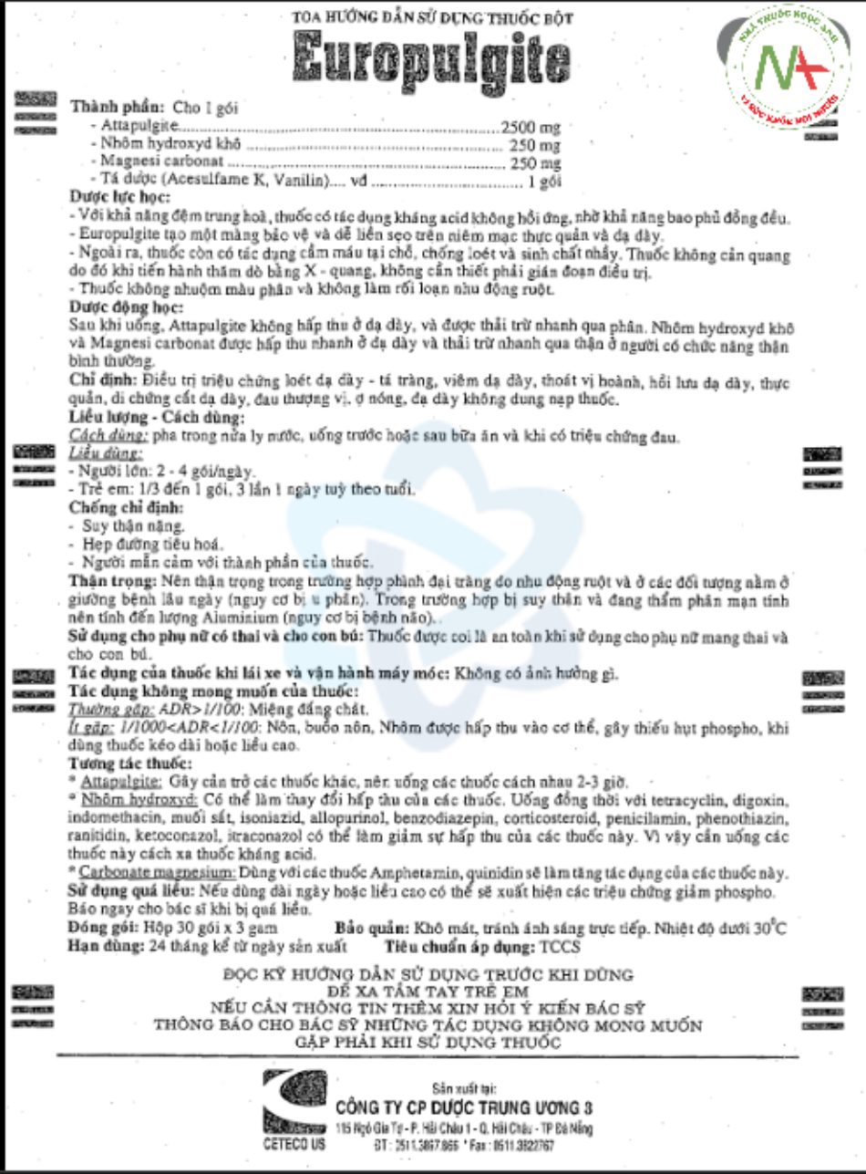 Thuốc Europulgite là một sản phẩm của Công ty cổ phần Dược phẩm TW 3, là thuốc dùng trong điều trị cho bệnh nhân viêm, loét dạ dày tá tràng, với các hoạt chất là Attapulgite, Nhôm hydroxyd khô và Magnesi carbonat.