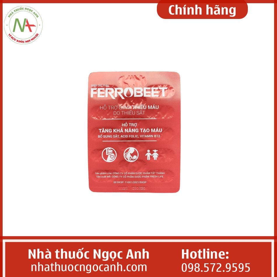 - Ferrobeet được bào chế từ củ dền đỏ kết hợp với Sắt, Acid Folic cùng các Vitamin giúp cải thiện tình trạng thiếu máu do thiếu sắt và ở những người có nhu cầu cao.