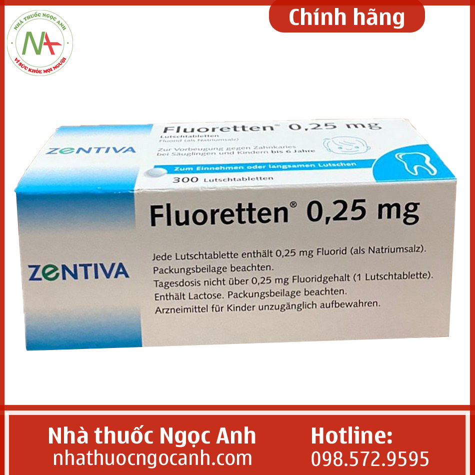 Fluoretten 0,25mg có thành phần chính là Natri Fluoride và Fluoride có công dụng chính là hỗ trợ phòng ngừa sâu răng ở trẻ em, đồng thời bảo vệ men răng hạn chế tình trạng ố hoặc mủn răng.