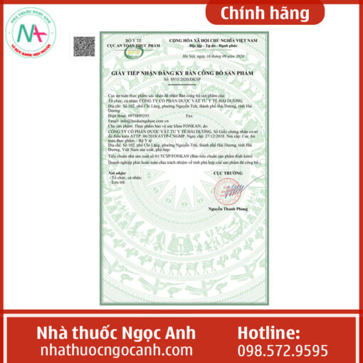 Fonkan là sản phẩm được sản xuất và đăng ký bởi Công ty cổ phần Dược Vật tư Y tế Hải Dương.