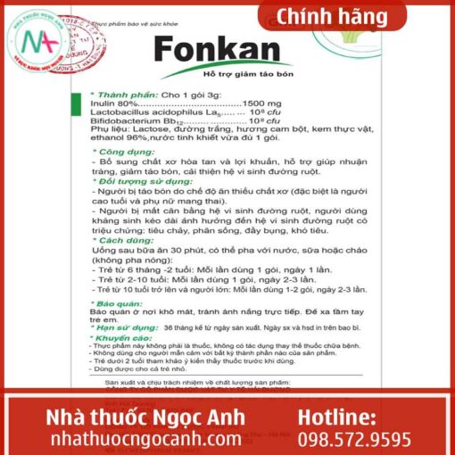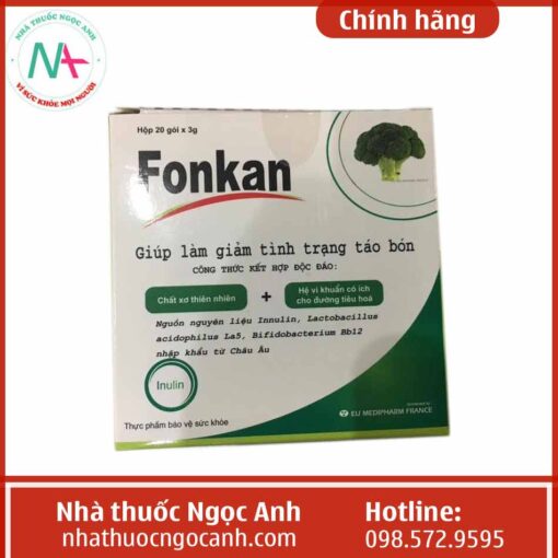 Fonkan là một thực phẩm chức năng hỗ trợ giảm táo bón có thành phần kết hợp giữa các vi khuẩn có lợi và Inulin một chất xơ hòa tan giúp cân bằng lợi khuẩn đường ruột gây ra các triệu chứng đau bụng, táo bón, dùng kháng sinh kéo dài hay ngộ độc gây tiêu chảy làm cho cơ thể tiêu hóa thức ăn và hấp thụ chất dinh dưỡng tốt hơn.