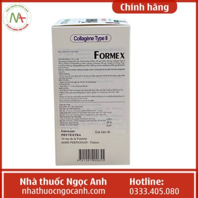 Formex là sản phẩm cung cấp các dưỡng chất thiết yếu để nuôi dưỡng sụn khớp, ngăn ngừa sự lão hóa, tái tạo lại sụn khớp và giúp cho khớp hoạt động linh hoạt. Sản phẩm được sản xuất bởi công ty Phytextra của Pháp với số đăng ký là 2731/2021/ĐKSP.