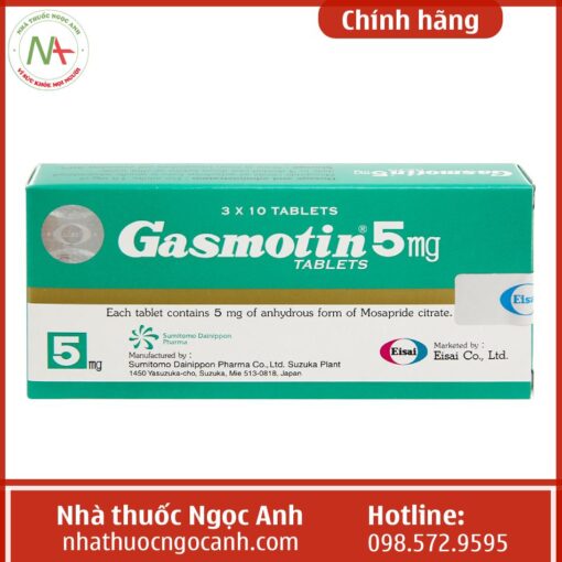 Thuốc Gasmotin 5mg là thuốc được dùng trong điều trị các triệu chứng dạ dày – ruột, mà có kết hợp với bị khó tiêu chức năng (bệnh viêm dạ dày mãn tính)…. Bài này nhà thuốc Ngọc Anh (nhathuocngocanh.com) xin được trả lời cho bạn các câu hỏi: Gasmotin 5mg là thuốc gì? Thuốc Gasmotin 5mg có tác dụng gì? Thuốc Gasmotin 5mg giá bao nhiêu? Dưới đây là thông tin chi tiết