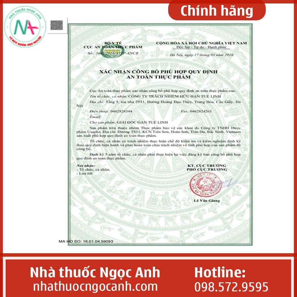 Trên đây là những thông tin về Giải độc gan Tuệ Linh mà Nhà thuốc Ngọc Anh đem đến cho bạn đọc. Nếu có bất cứ thắc mắc nào bạn có thể liên hệ trực tiếp với Nhà thuốc Ngọc Anh để được giải đáp.