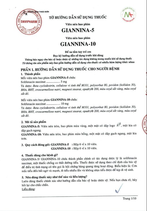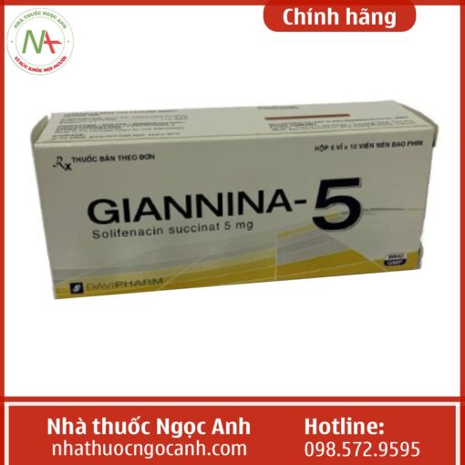 Giannia-5 là một sản phẩm của công ty cổ phần Dược phẩm Đạt Vi Phú, là thuốc dùng trong điều trị cho các triệu chứng xảy ra do bàng quang tăng hoạt động như tiểu không tự chủ, tiểu nhiều, tiểu gấp, với các hoạt chất là solifenacin succinate.
