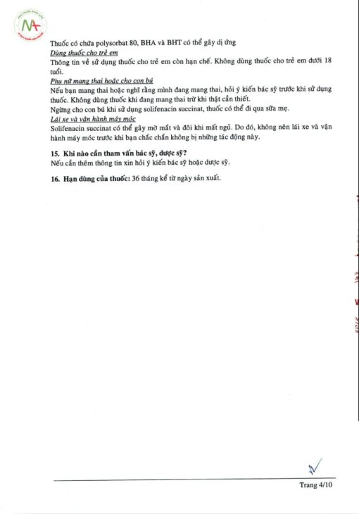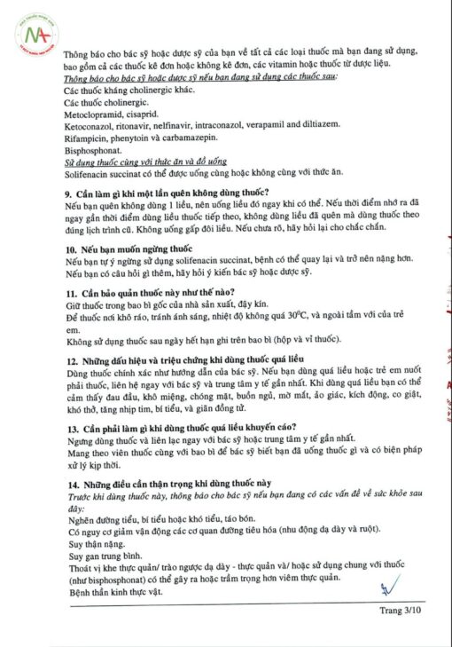 - Đã có ghi nhận phản ứng phản vệ trên người sử dụng solifenacin succinat. Trên người có phản ứng phản vệ, hãy dừng solifenacin và sử dụng các biện pháp điều trị với xét nghiệm phù hợp.