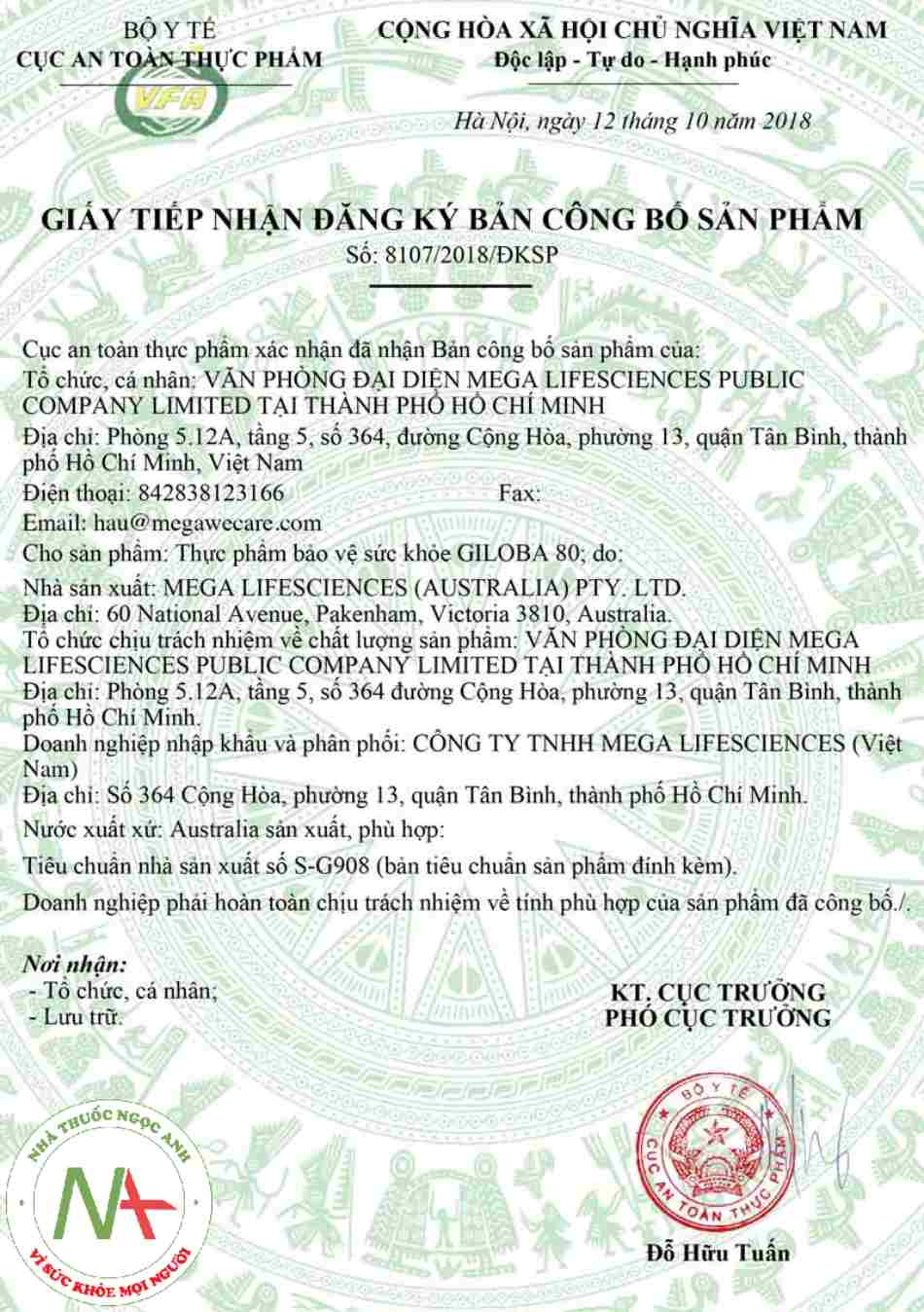 - Số đăng ký sản phẩm: 8107/2018/ĐKSP