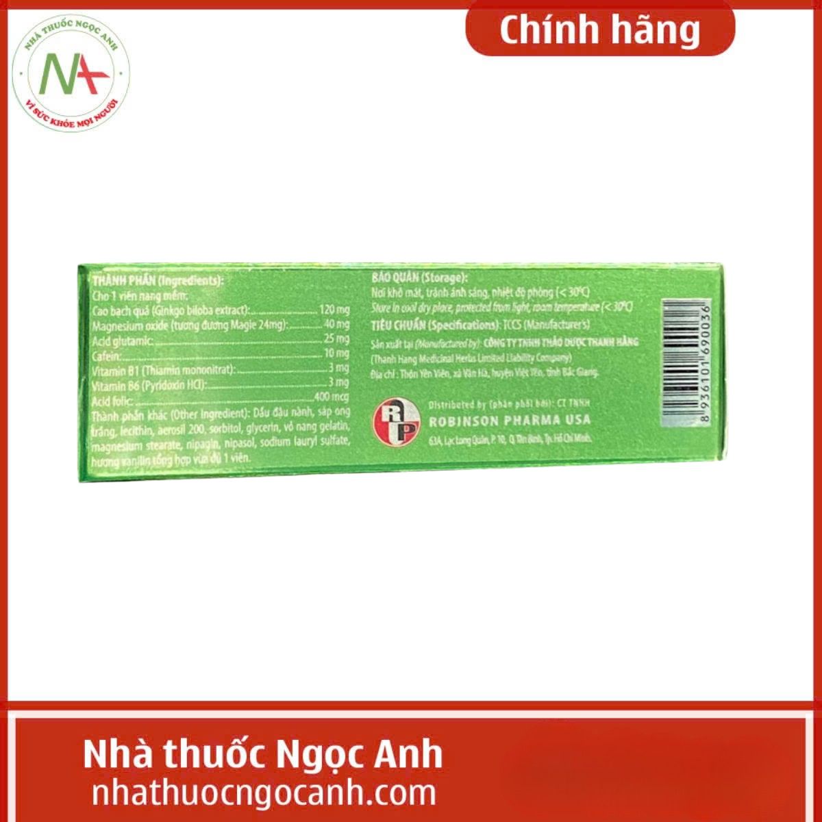 - Ginkgo biloba extract (Cao bạch quả) hỗ trợ cải thiện quá trình lưu thông máu lên não, giúp cung cấp lượng oxy và chất dinh dưỡng cần thiết cho não, tăng cường khả năng ghi nhớ, tăng cường khả năng tập trung. Bên cạnh đó, cao bạch quả còn chứa các hoạt chất có đặc tính chống oxy hóa giúp hạn chế sự hoạt động của các gốc tự do.