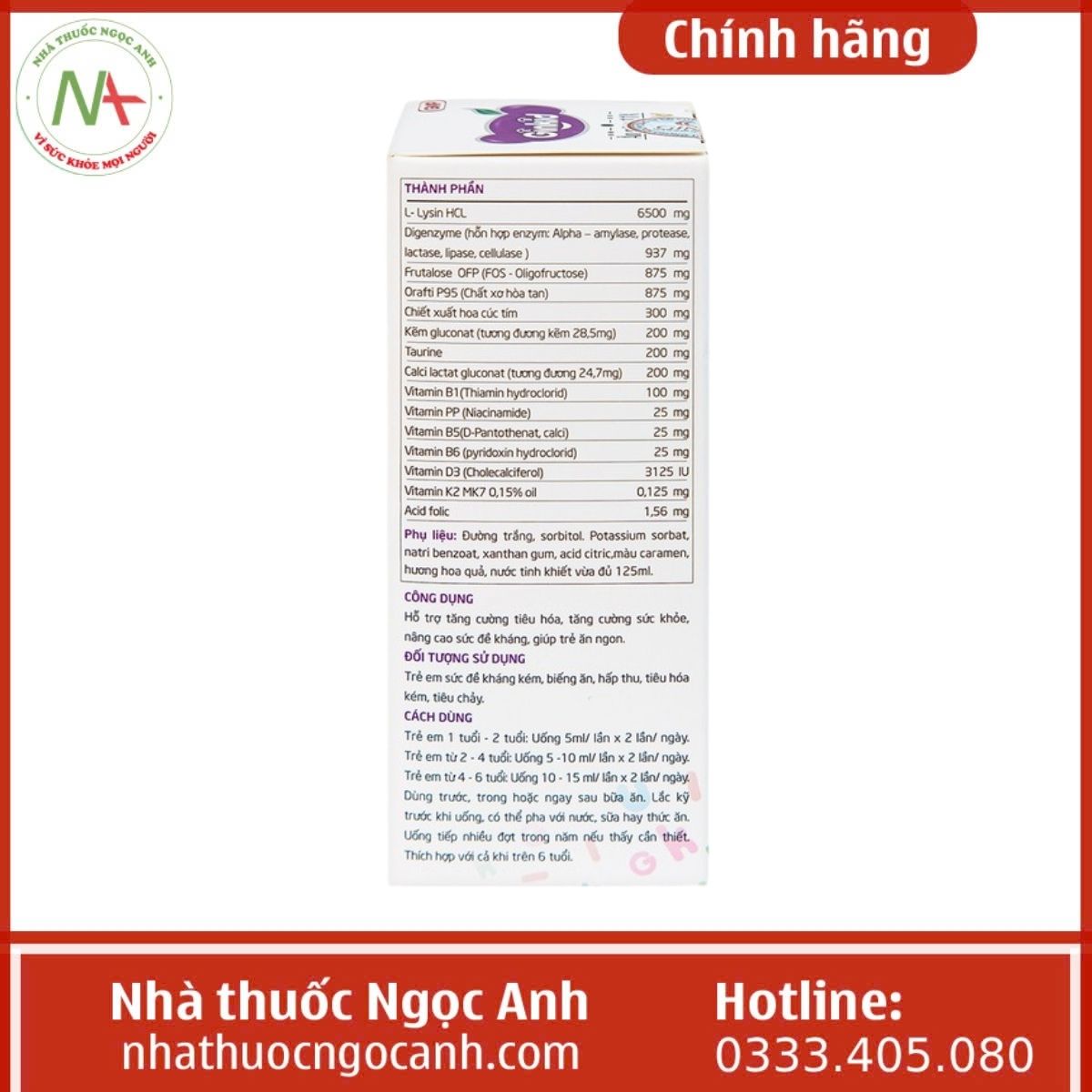 L-Lysin HCL: Đây là một loại axit amin thiết yếu, đóng vai trò quan trọng trong quá trình tăng trưởng và phát triển toàn diện. L-Lysin giúp trẻ ăn ngon hơn, hỗ trợ hấp thu canxi và thúc đẩy chiều cao.